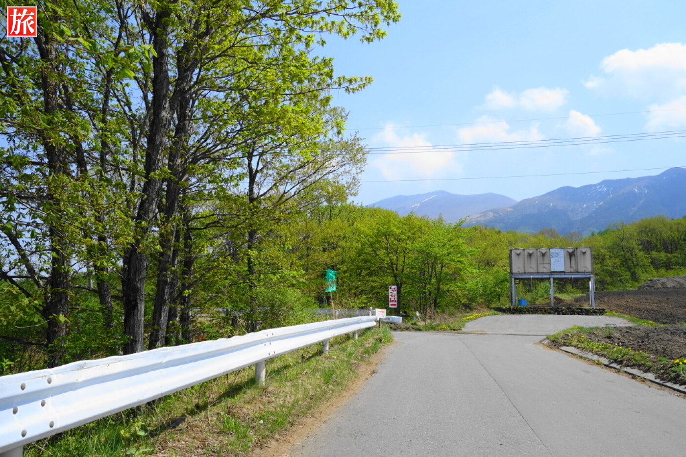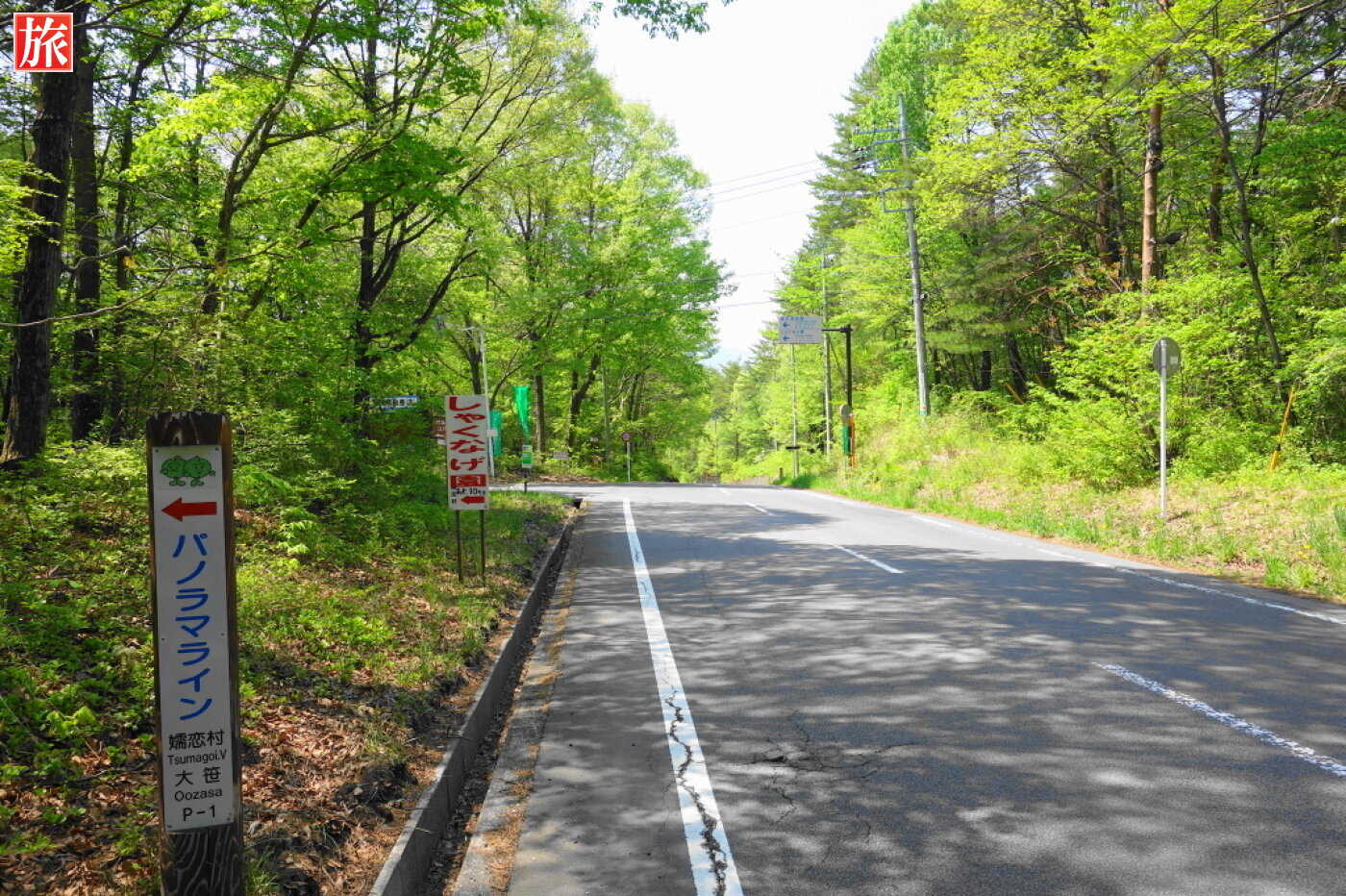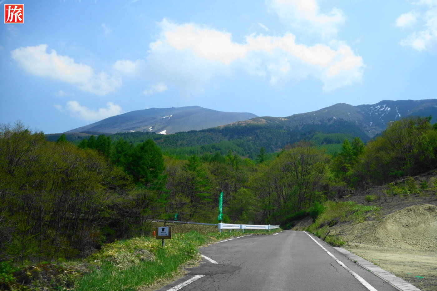 県道大笹・北軽井沢線から、つまごいパノラマラインへ。つまごいパノラマラインの左折ポイント。正面右に浅間山。