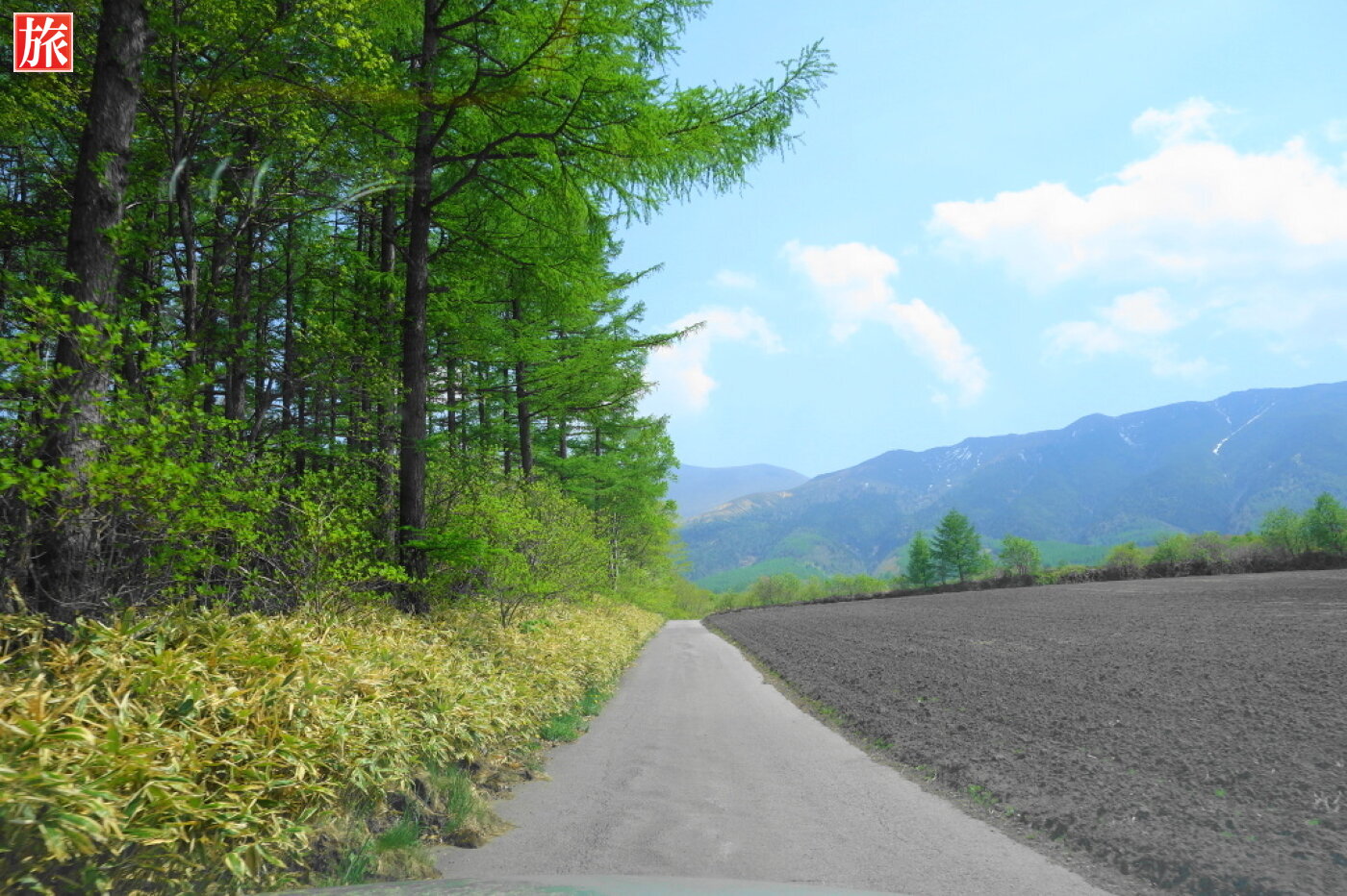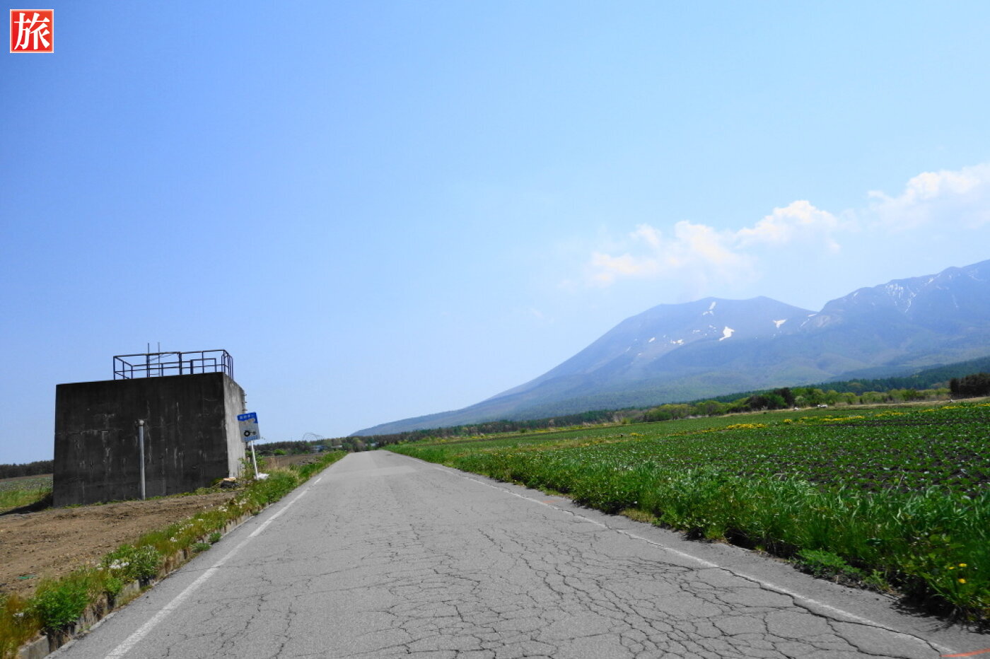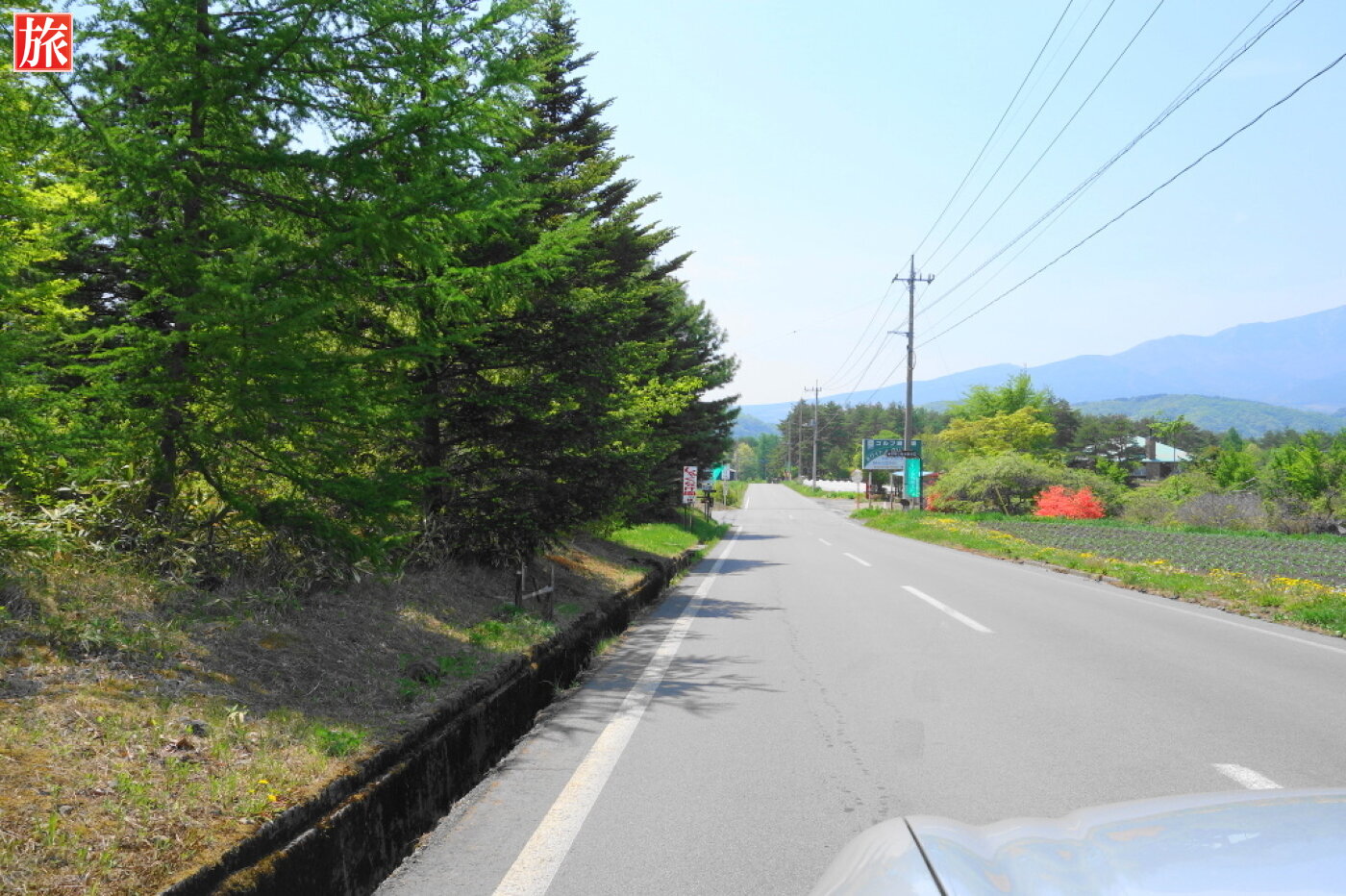 県道大笹・北軽井沢線から、つまごいパノラマラインへ。つまごいパノラマラインの左折ポイント。正面右に浅間山。