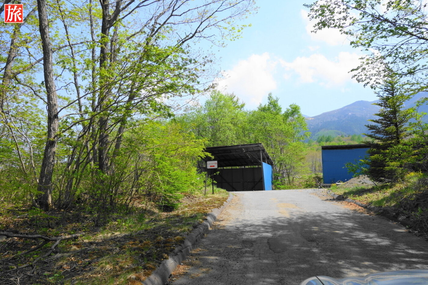 大分近づいてきました。浅間山が正面に大きく見えます。あと800mの看板。入口です。