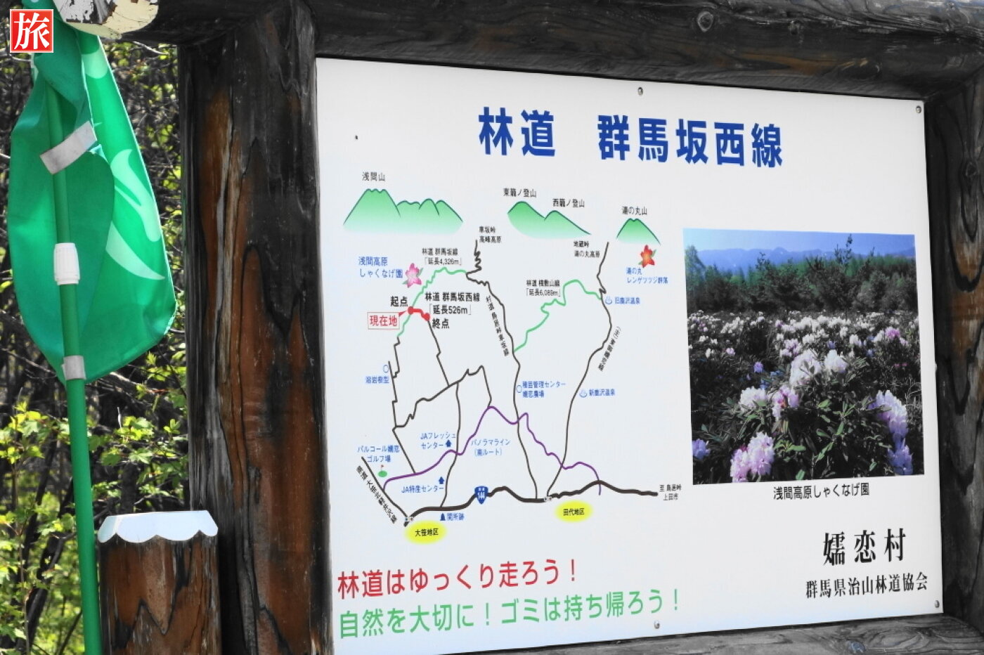 場所は、浅間山の北側に麓にあります。上信越自動車道、碓氷・軽井沢ICで降り、R146から鬼押し出しハイウエーへ、鬼押出し園を過ぎ約2.5Kmほど進み、県道大笹・北軽井沢線(235号)へ左折しパルコールゴルフ場を左折し、つまごいパノラマラインへ、看板の案内通り進む。碓氷・軽井沢ICより約45km。