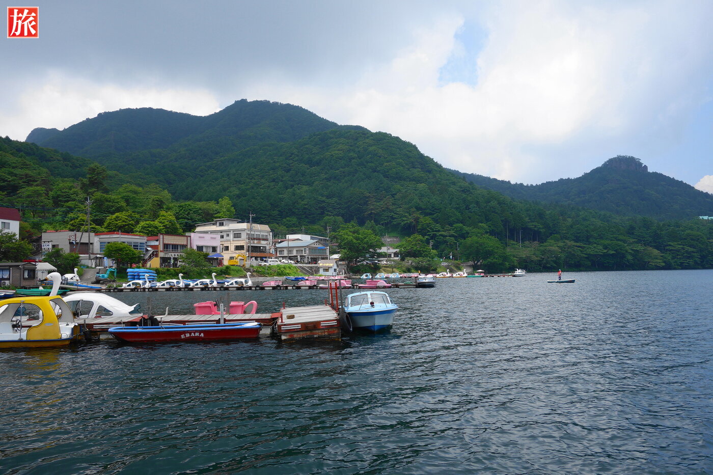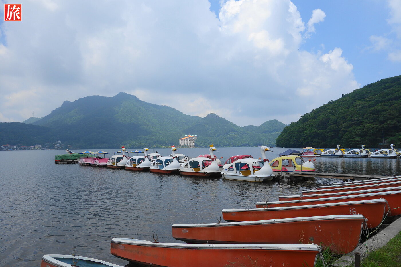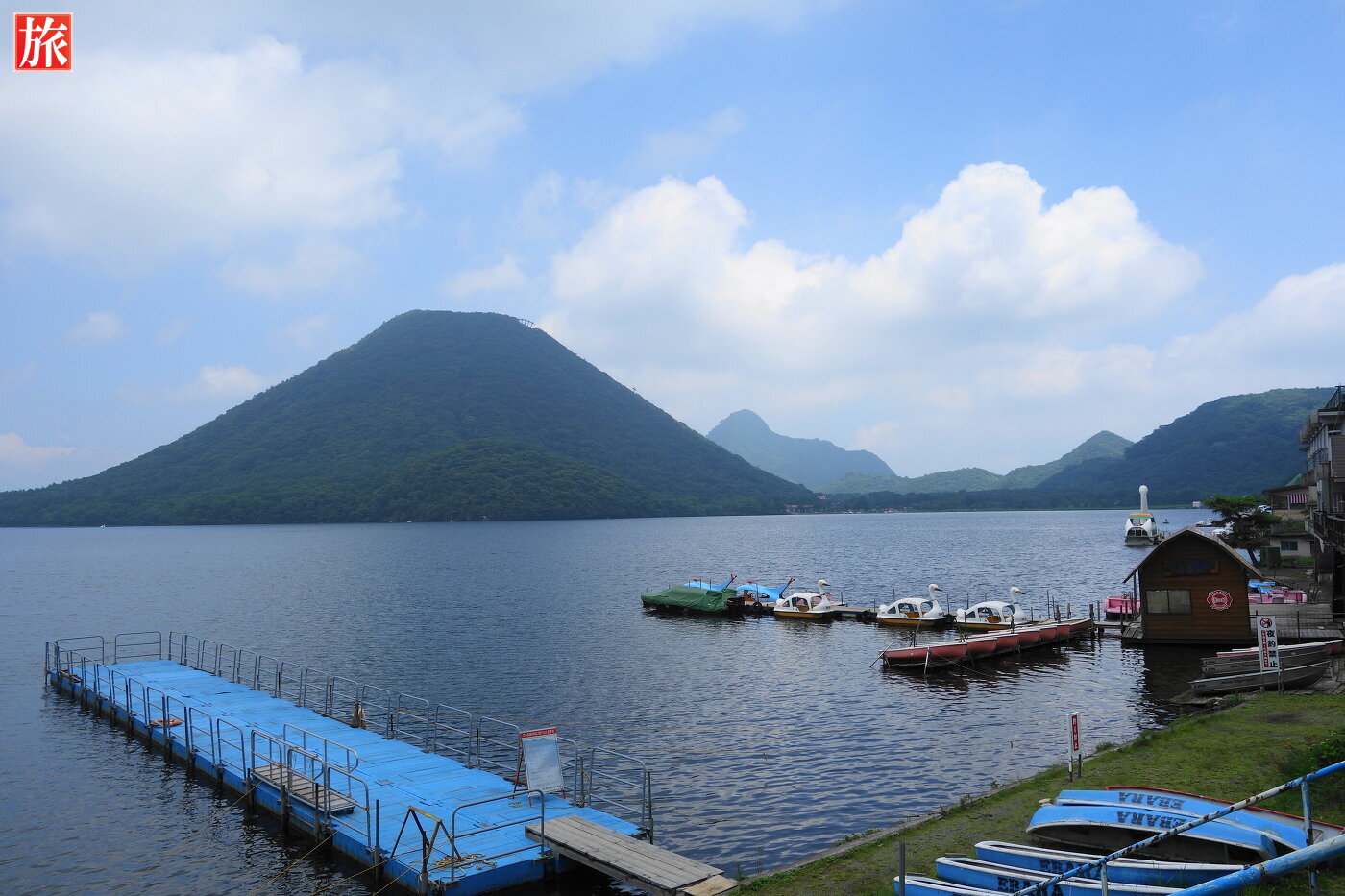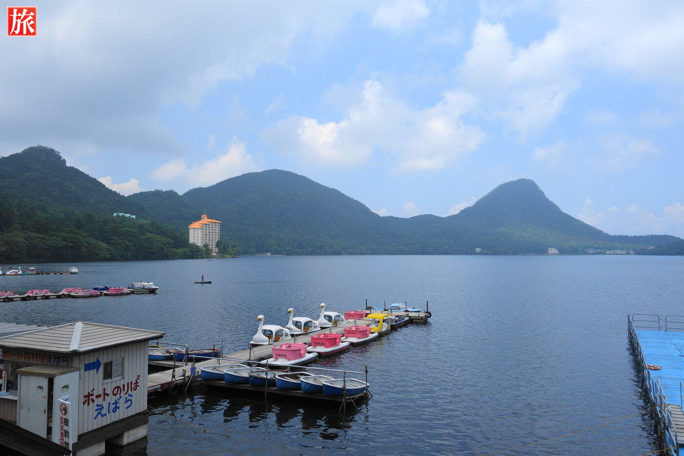正面に榛名富士山が見える抜群のロケーションです。左手には烏帽子岳・髪櫛山(びんぐしやま)が見えます。足漕ぎ用のスワン。