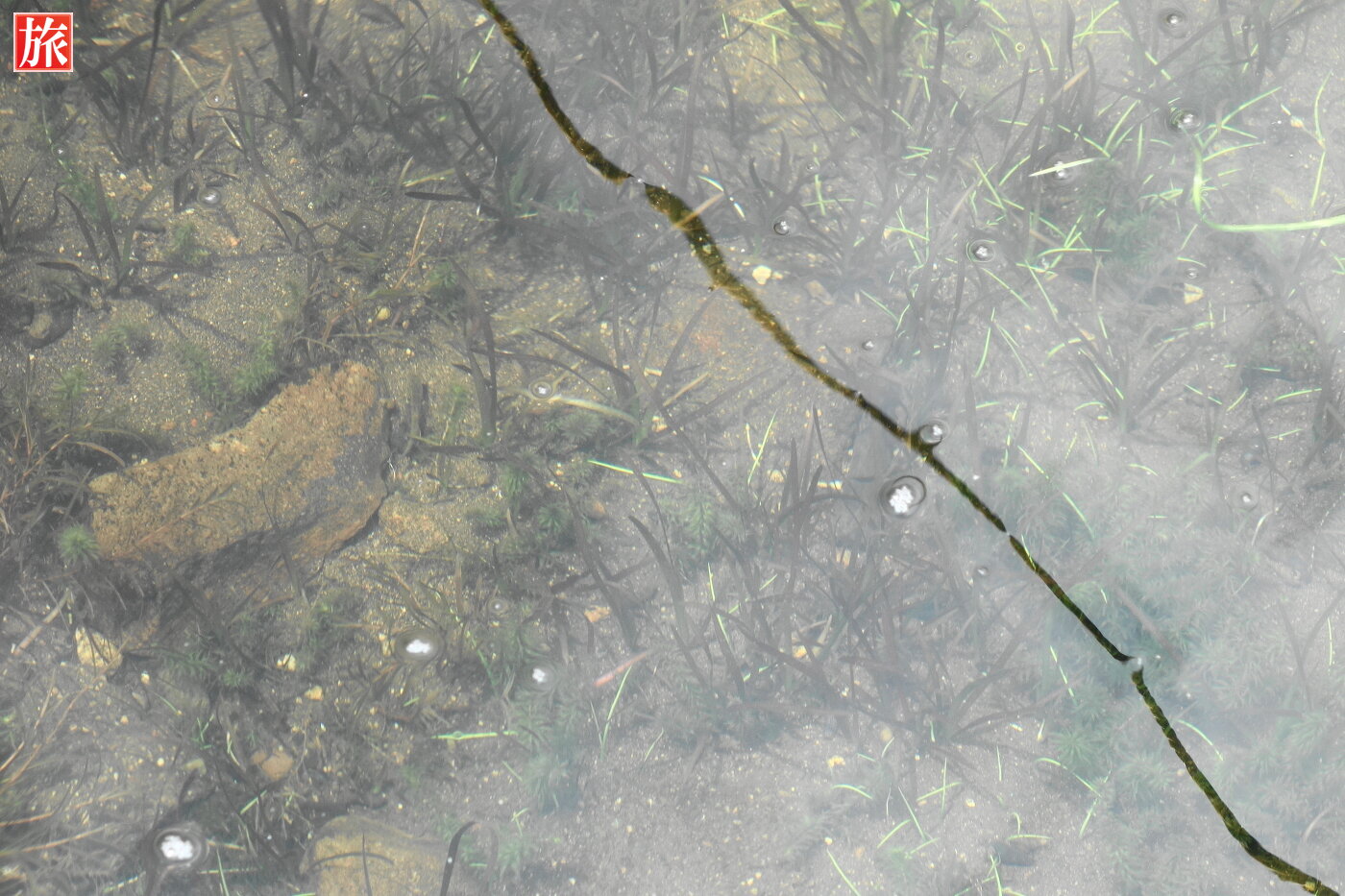 湖の浅瀬の様子。遊泳禁止となっていて、湧き水で水温が低く冷たく湖底は背丈の高い藻や水草が生い茂っているそうです。
