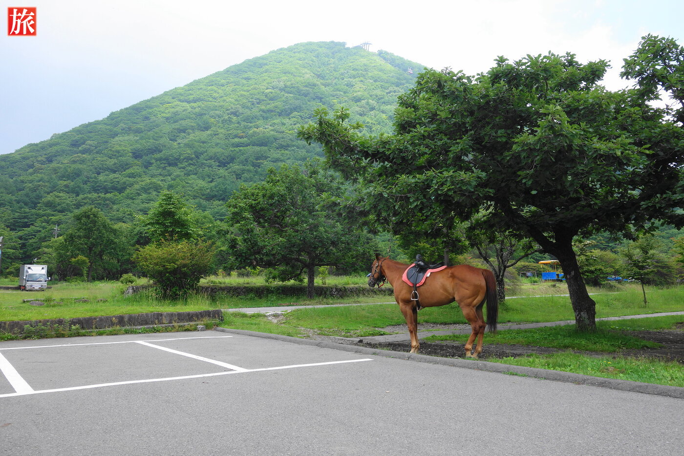 ビジターセンター付近の様子。駐車場にお馬さん!この付近の駐車場が一番大きいようです。標高1084mの榛名湖です。東側には榛名富士。