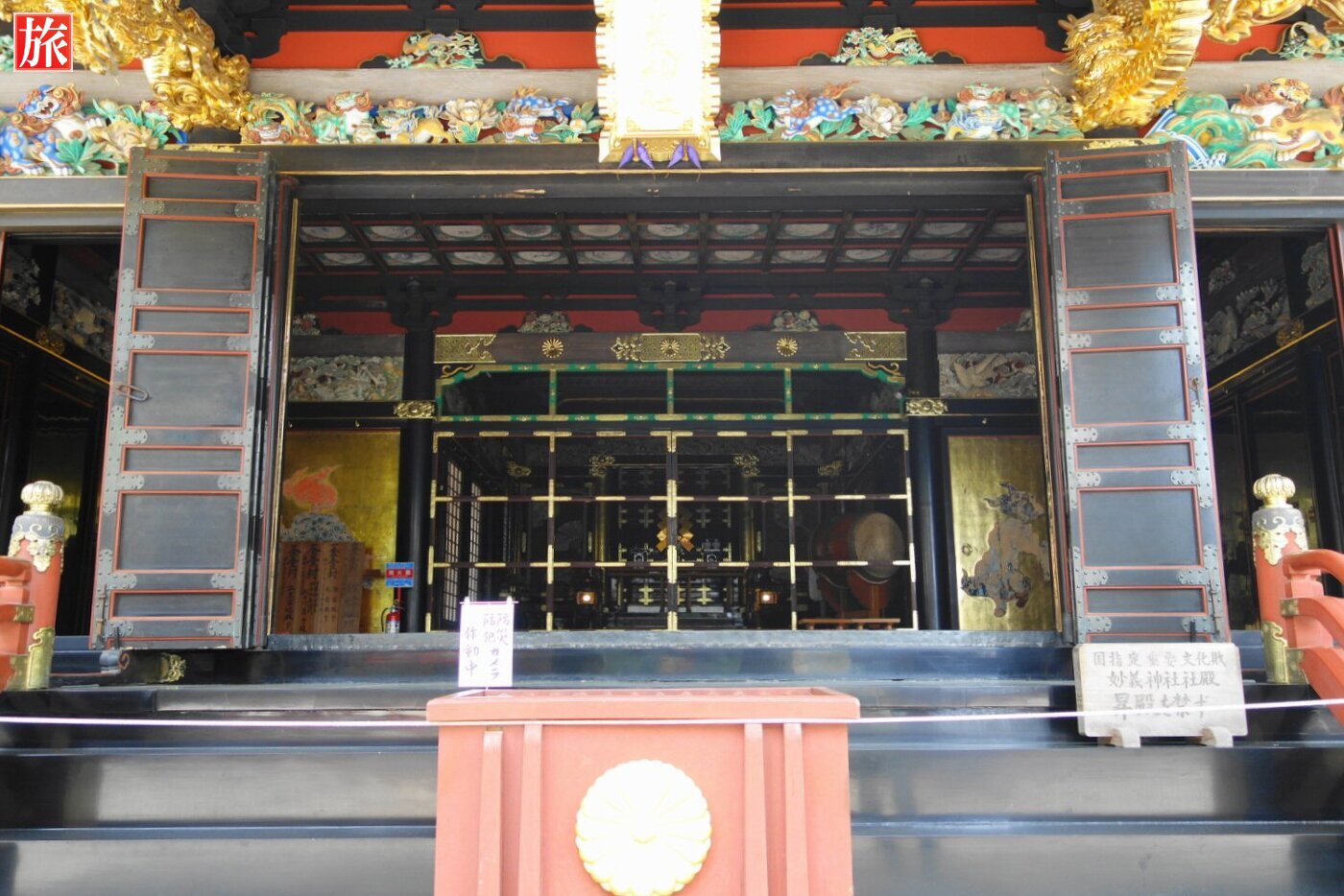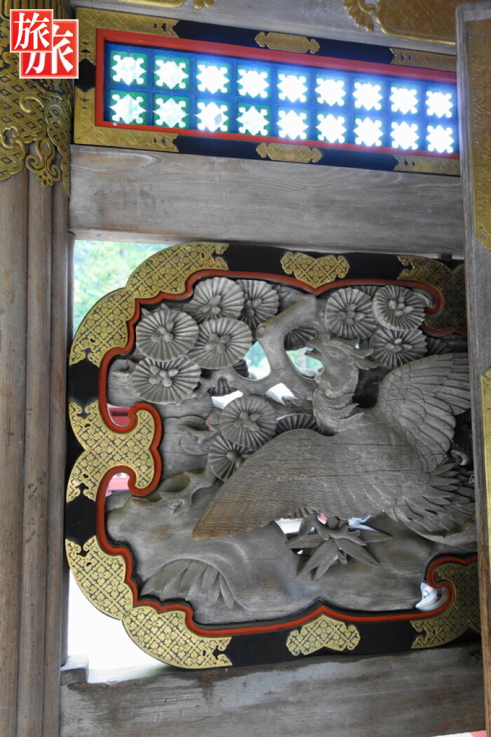 御本社を右方向から。拝殿の正面。日光東 照宮の彫刻師がここに来て彫りあげたと伝えられる趣向を凝らした装飾が沢山あります。鶴の彫刻。