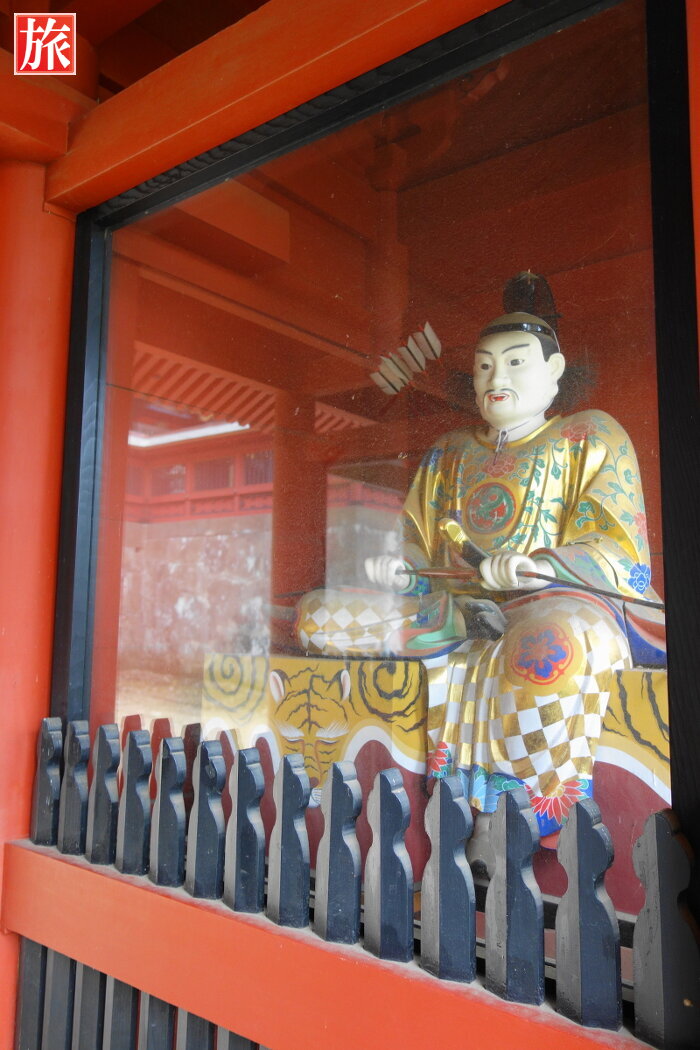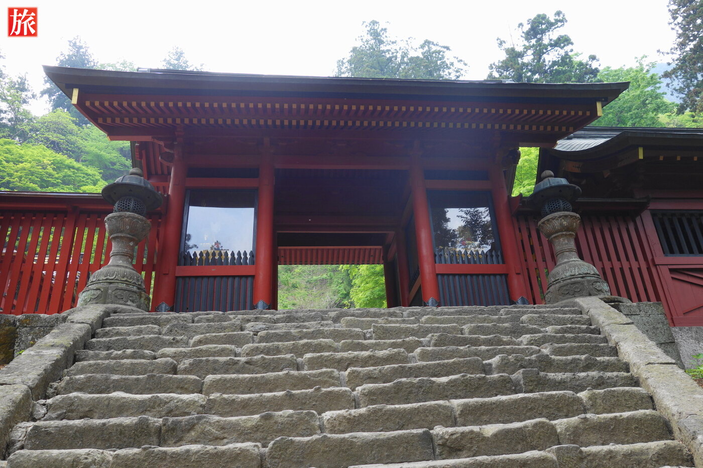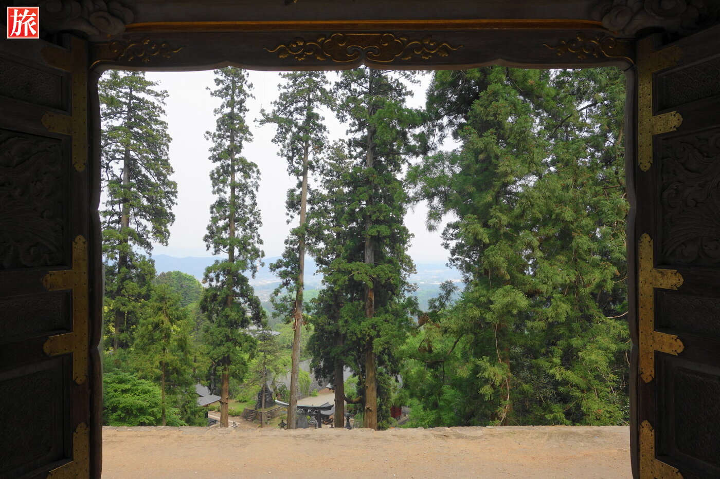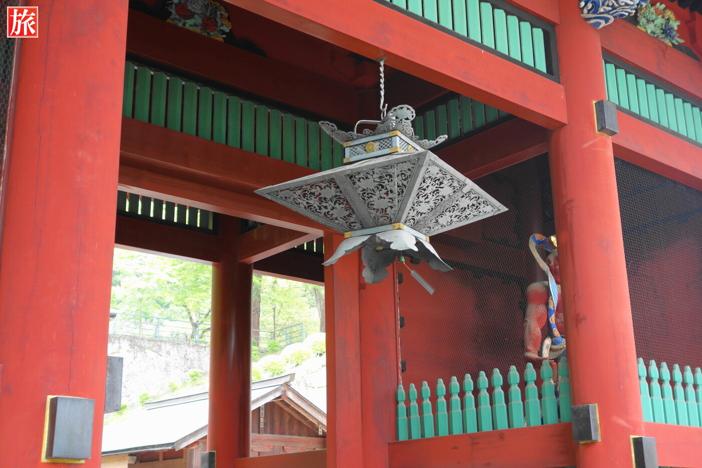 随神門の上部には唐門があります。宝暦六年(1756)の建造の唐門から見た風景。唐門には全国有数の趣向を凝らした装飾がしてあります。天井には龍が。松に鳳風の透彫。