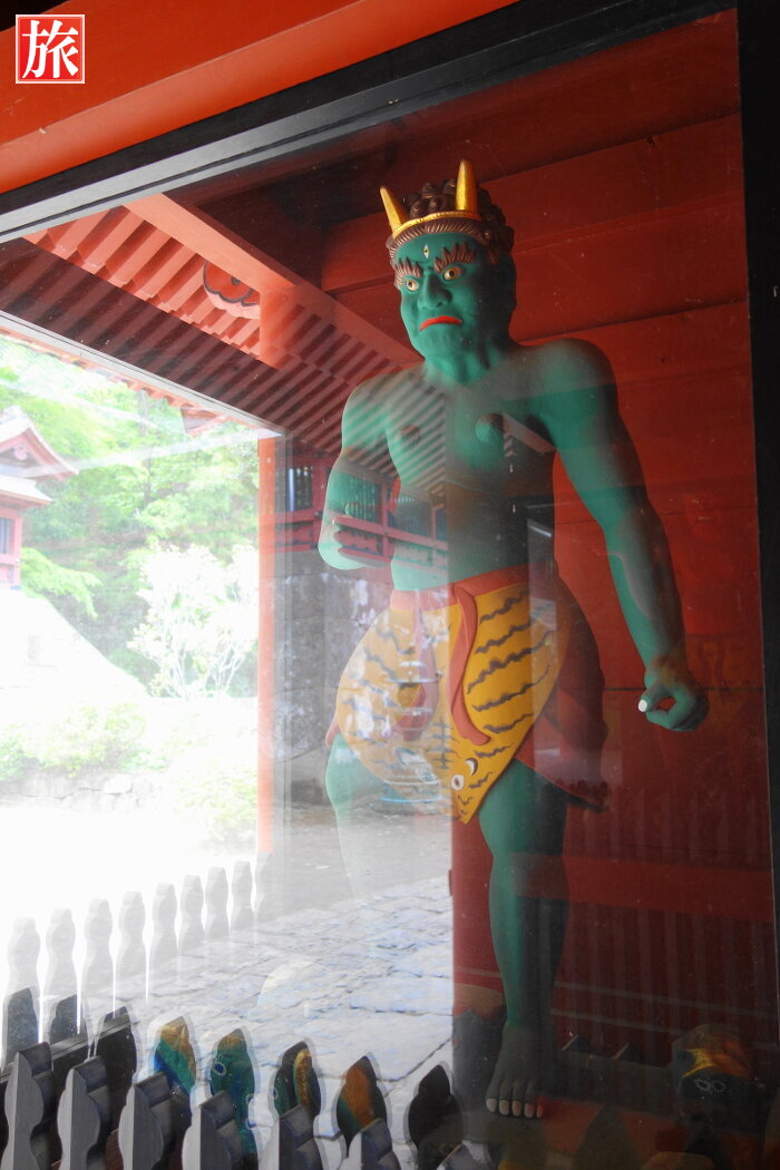 妙義神社 北門付近の風景脇参道から上ってきたので、随神門まで移動しました。門内右青鬼像。門内左の赤鬼像。同じく左右に大臣像がありました。