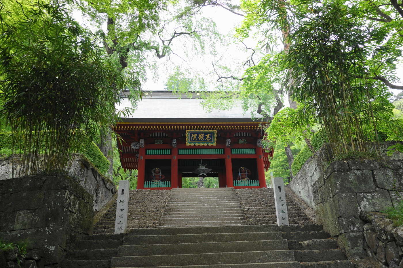 総門は関東一の壮大さを誇る、鮮やかな朱色の総門。高さ12メートル。切妻造りの八脚門。国指定重要文化財。