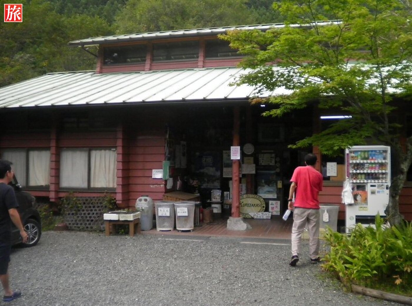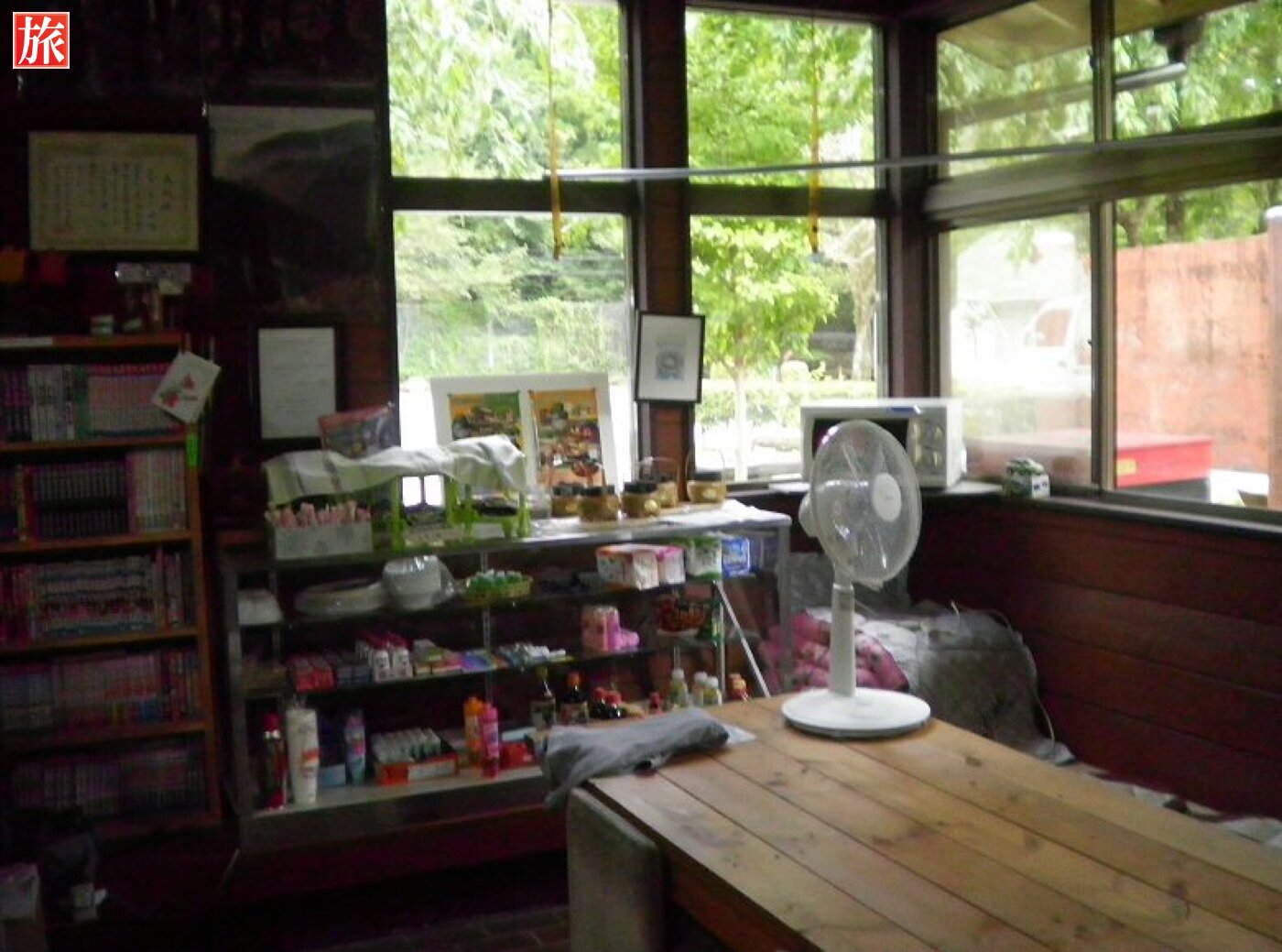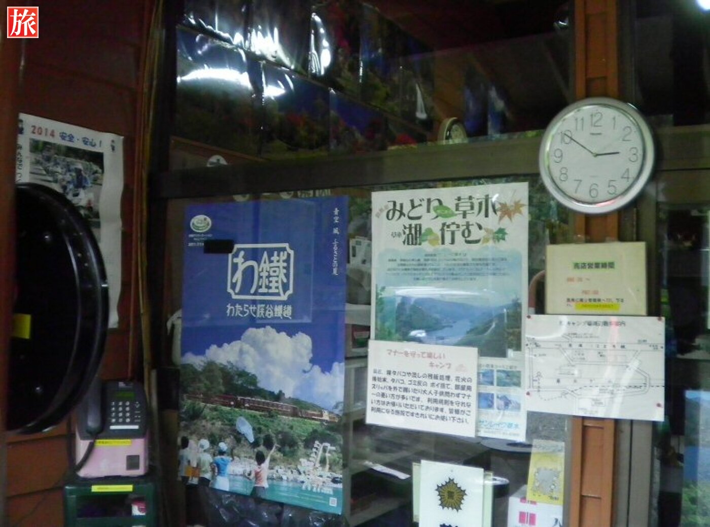 事務所内の風景、大体のものはここで揃う!?釣竿の貸し出しもあります、近くの渓流で釣りするのも良いでしょう。事務所の直ぐ前には吊り橋があります。