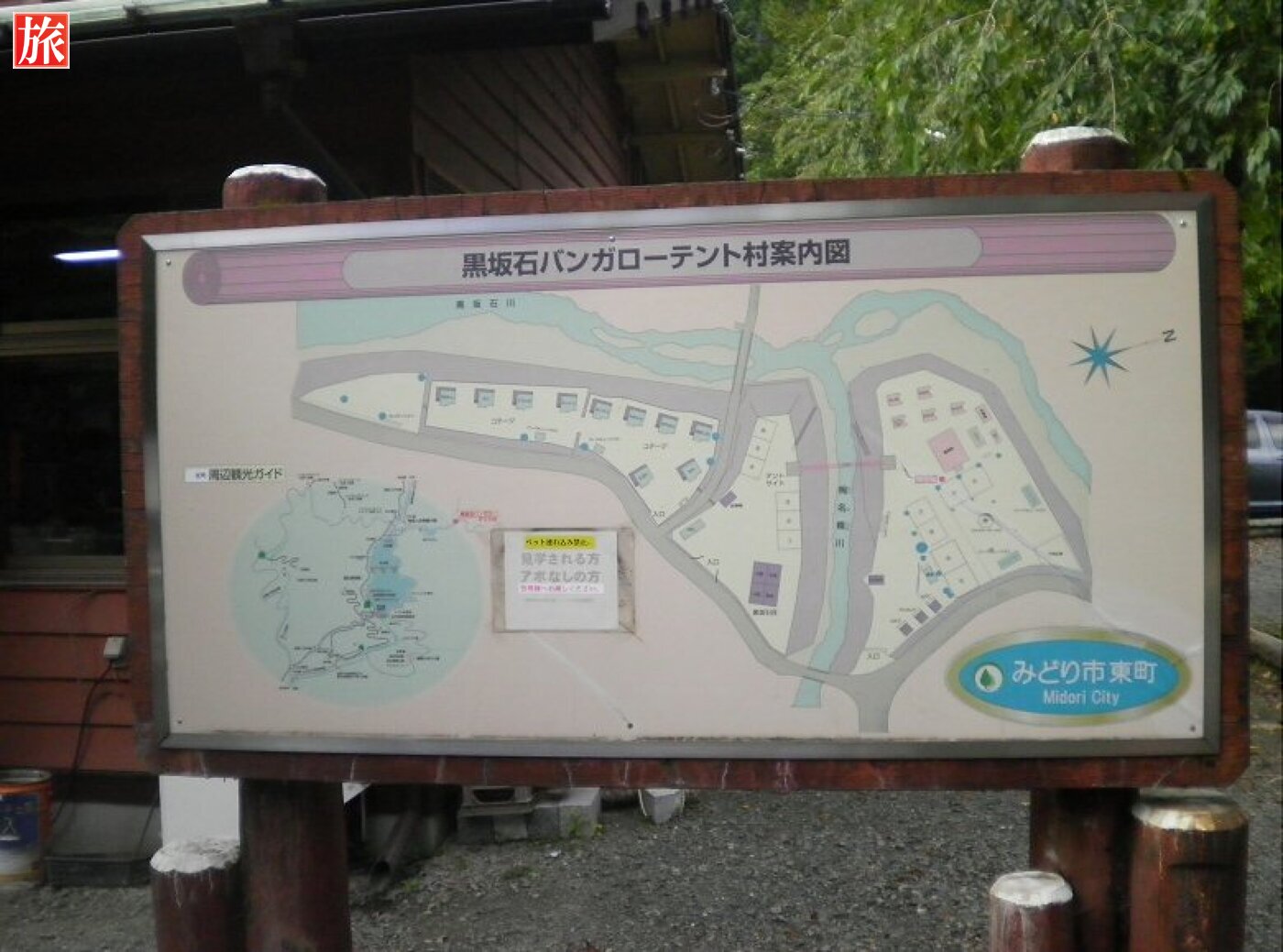 群馬県国道122号線を日光方面へ、右手に見える草木湖の東を約4km、渓流沿い登り進んだ所にあります。山奥、空気は綺麗で標高は700m強。au携帯は完全に圏外でした・・。