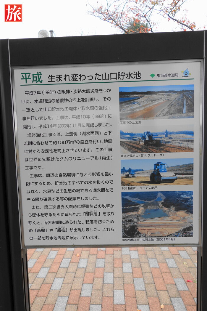 山口貯水池施設案内の看板。堰堤の様子です。ダム湖100選・狭山湖の石像。