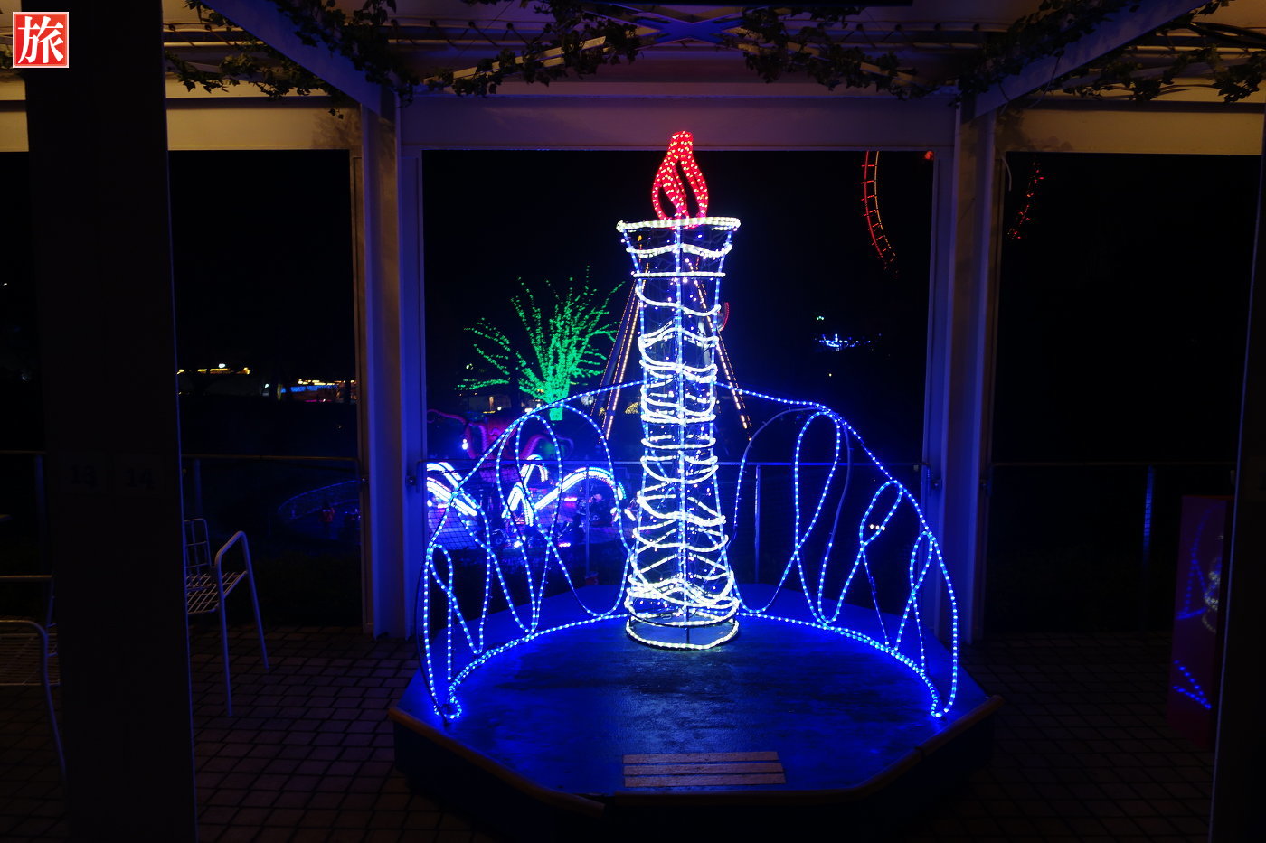 入場しですぐにある『結婚したくなるイルミ』の看板。『三本のかがや木』方向の様子です。ジャイロタワーへ向かう通路の様子です。園内を左方向から回りました。ジャイロタワーとジェットコースター。王冠があがってきました。王冠が上まで上がりました。