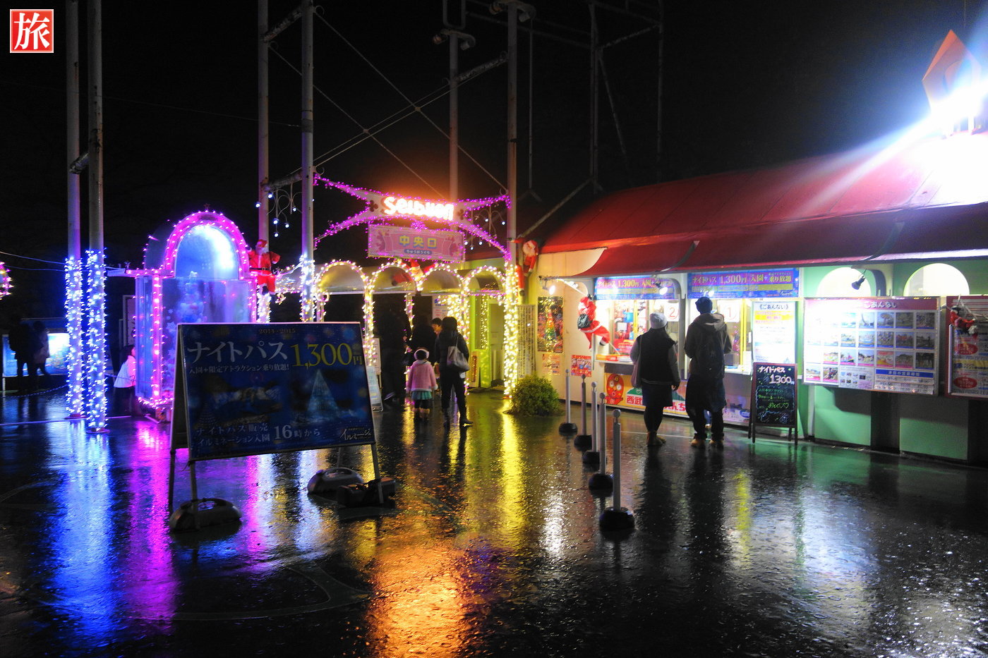 中央口ゲート(西武園遊園地駅下車)方向から。入場受付です。入場料は大人一人800円でした。中央口ゲートです。西武園遊園地付近の道路から幻想的なジャイロタワーとジェットコースターを望む。