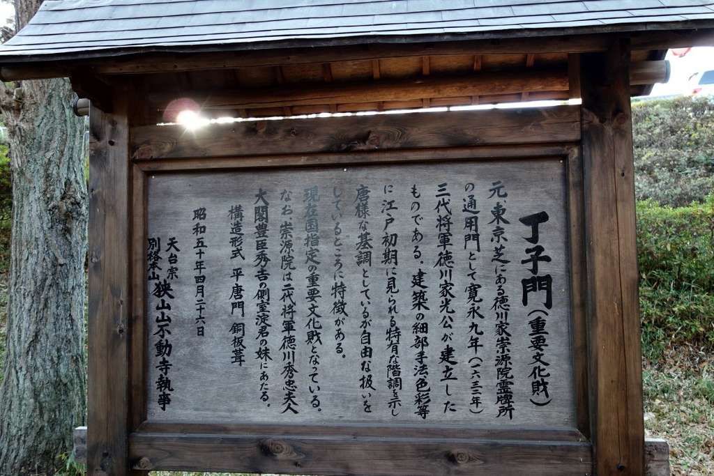 狭山山不動寺、入り口「勅額門」(正門)と境内案内板。勅額門(国重要文化財・増上寺にあった徳川秀忠(台徳院)の廟から移設)。階段上に見えるのは「御成門」です。