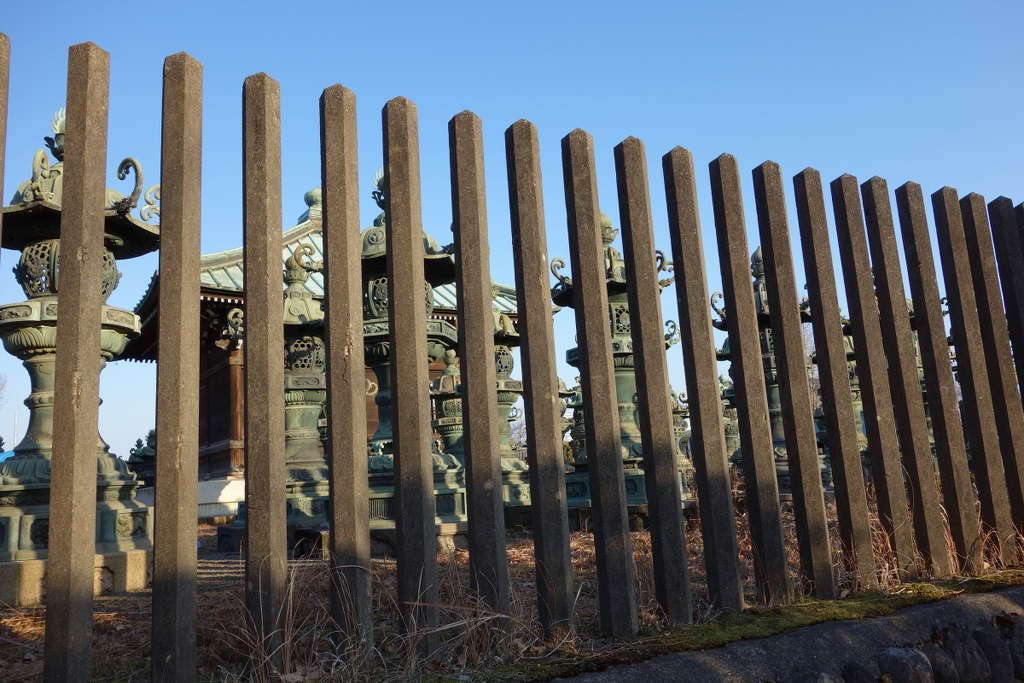 羅漢堂山門(虎ノ門田中平八郎邸の門を移築)。羅漢堂(港区麻布井上馨邸よりを移築)・手前に唐金灯籠。全国の大名から献納された唐金灯籠。