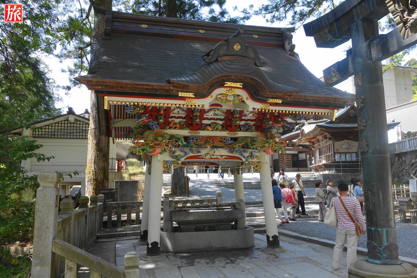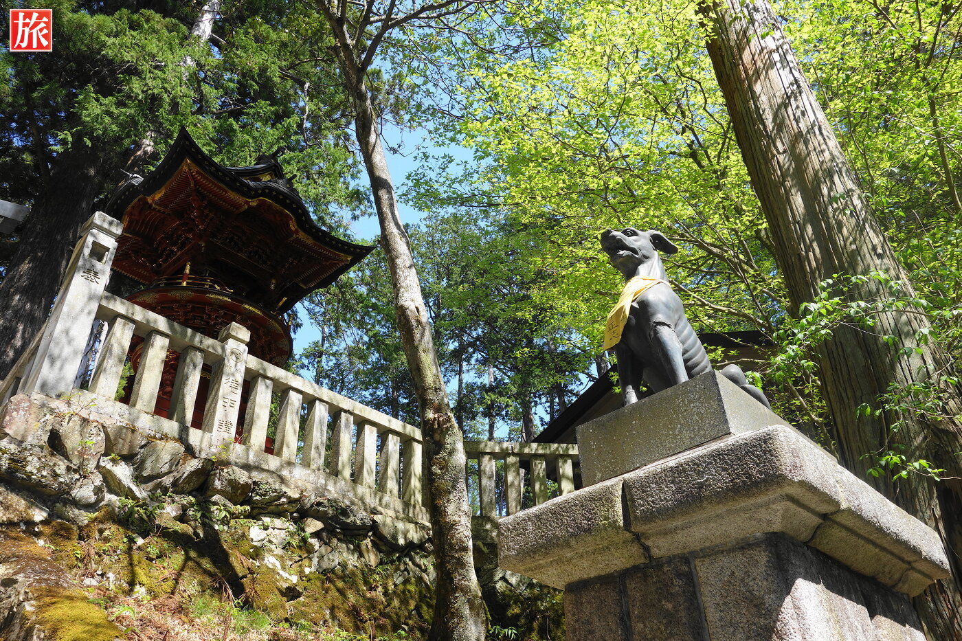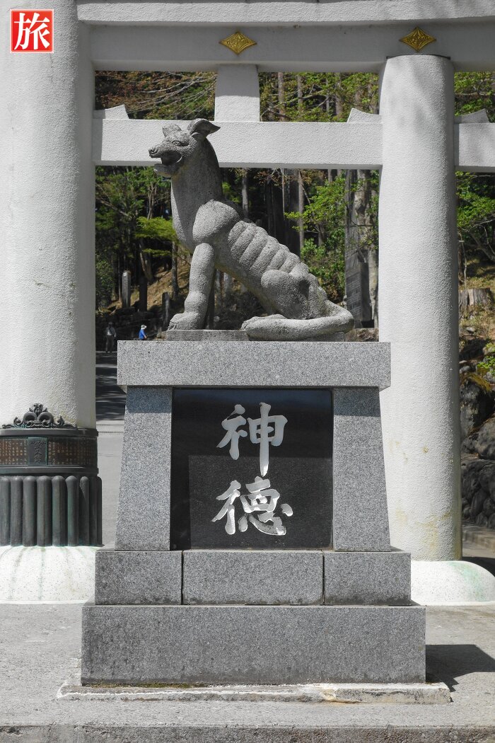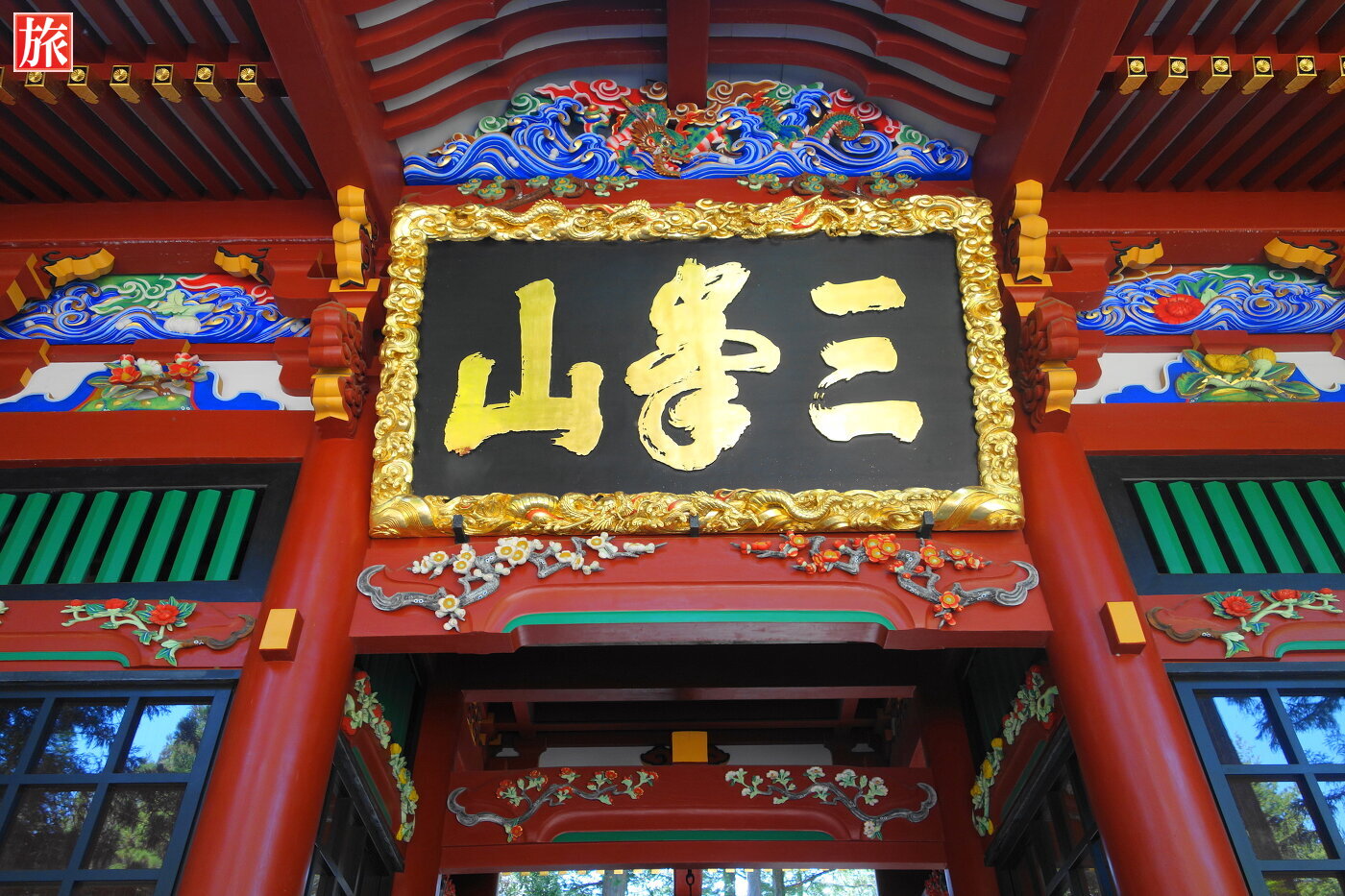 煌びやかな山門に掛かる扁額。山門の両脇にも口と耳を赤くした狼の狛犬。
