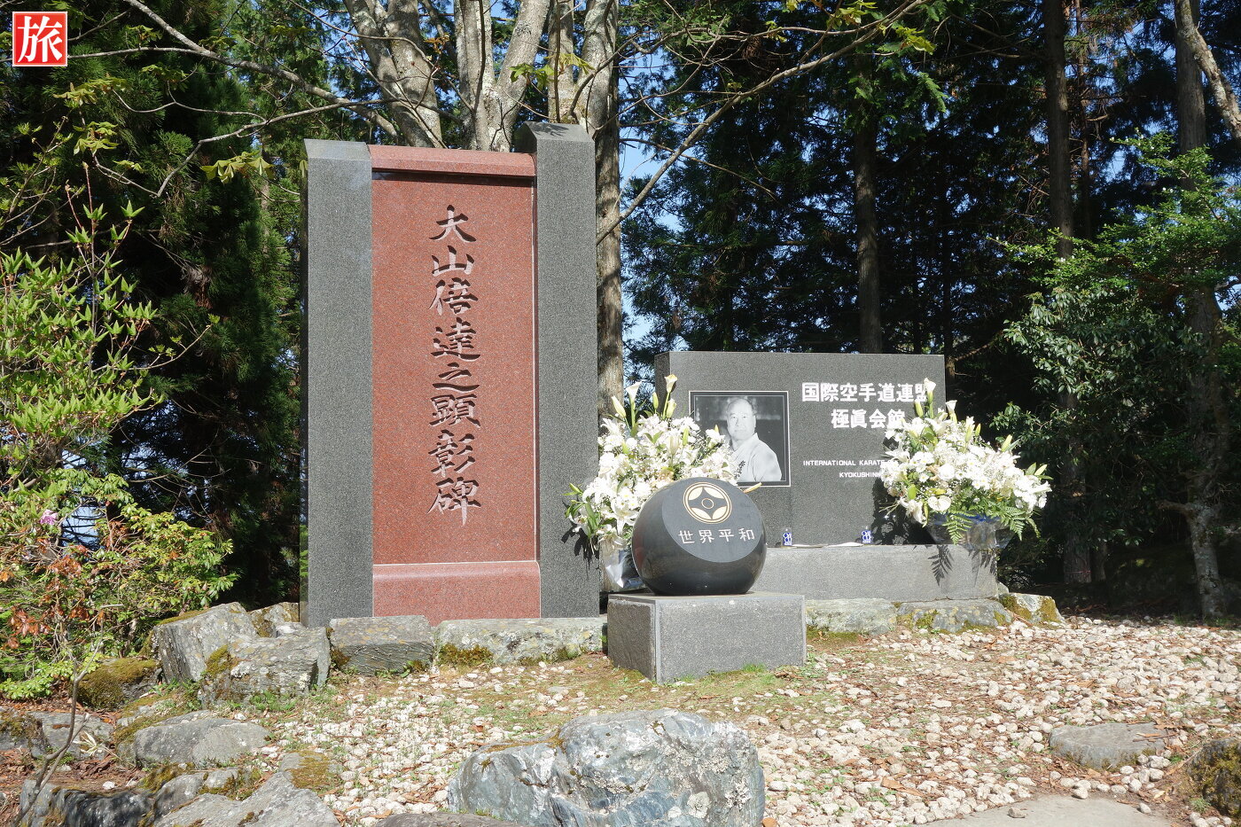 遥拝殿から山門を眺めた様子。山中要作先生顕彰碑。大山倍達氏の碑。なんでも三峯神社で山篭りの修行を何度も行っていたそうです。日本武尊(神社の創始者とされる)の銅像。