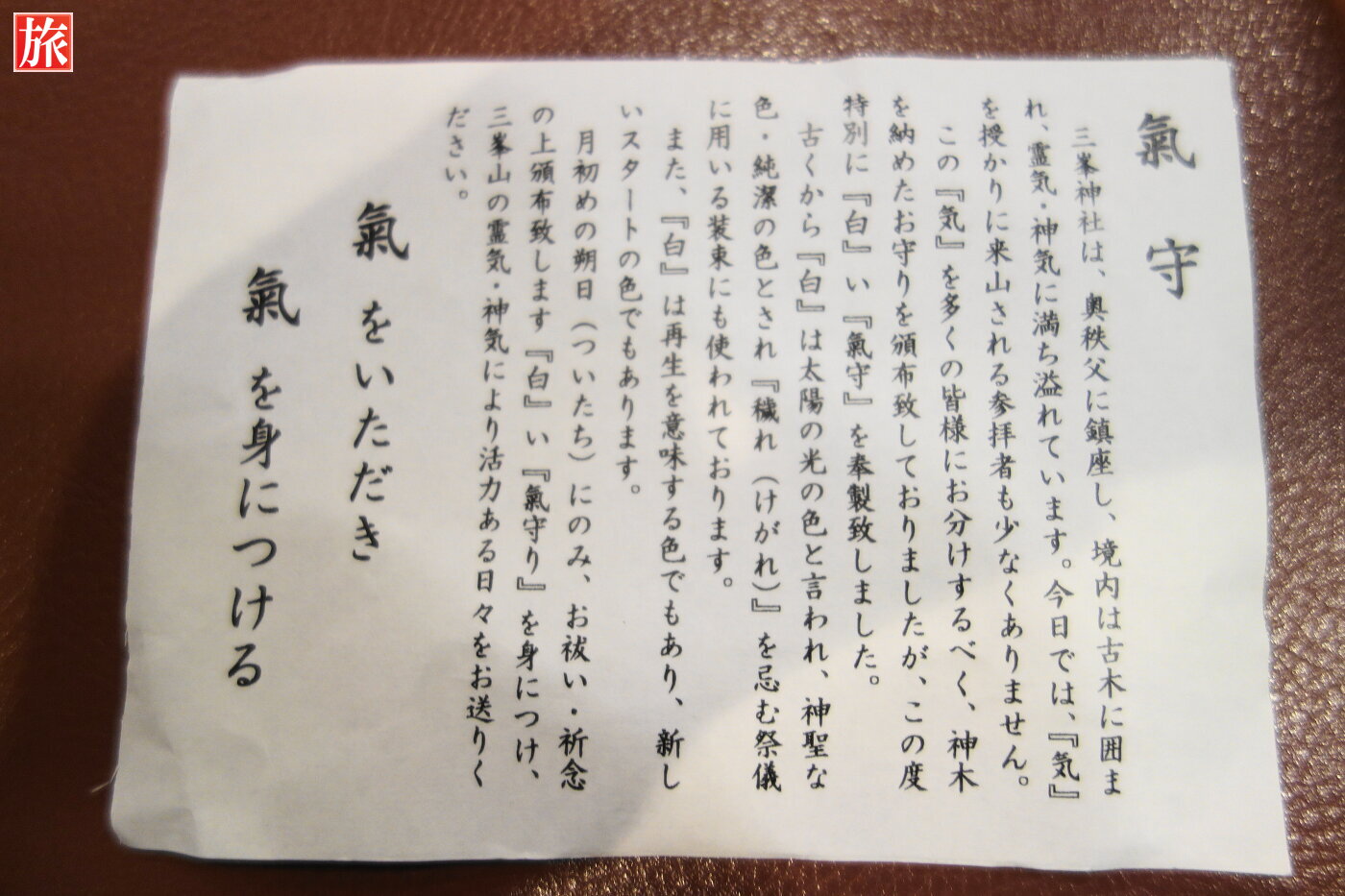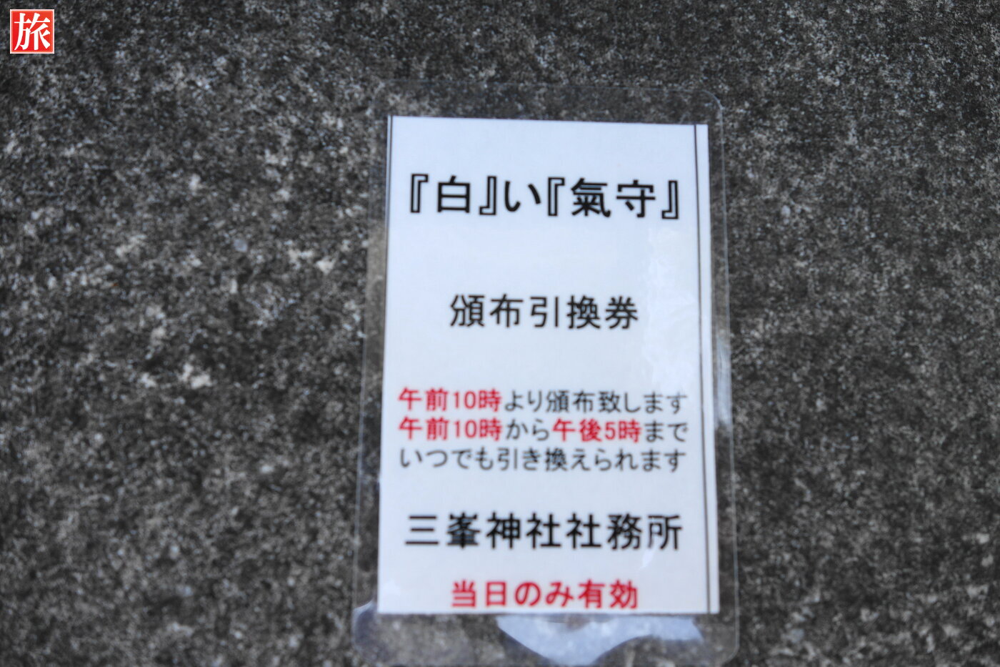三ツ鳥居前で配布されていた「白」い「氣守」の整理券。「白い氣守」。氣守の説明。