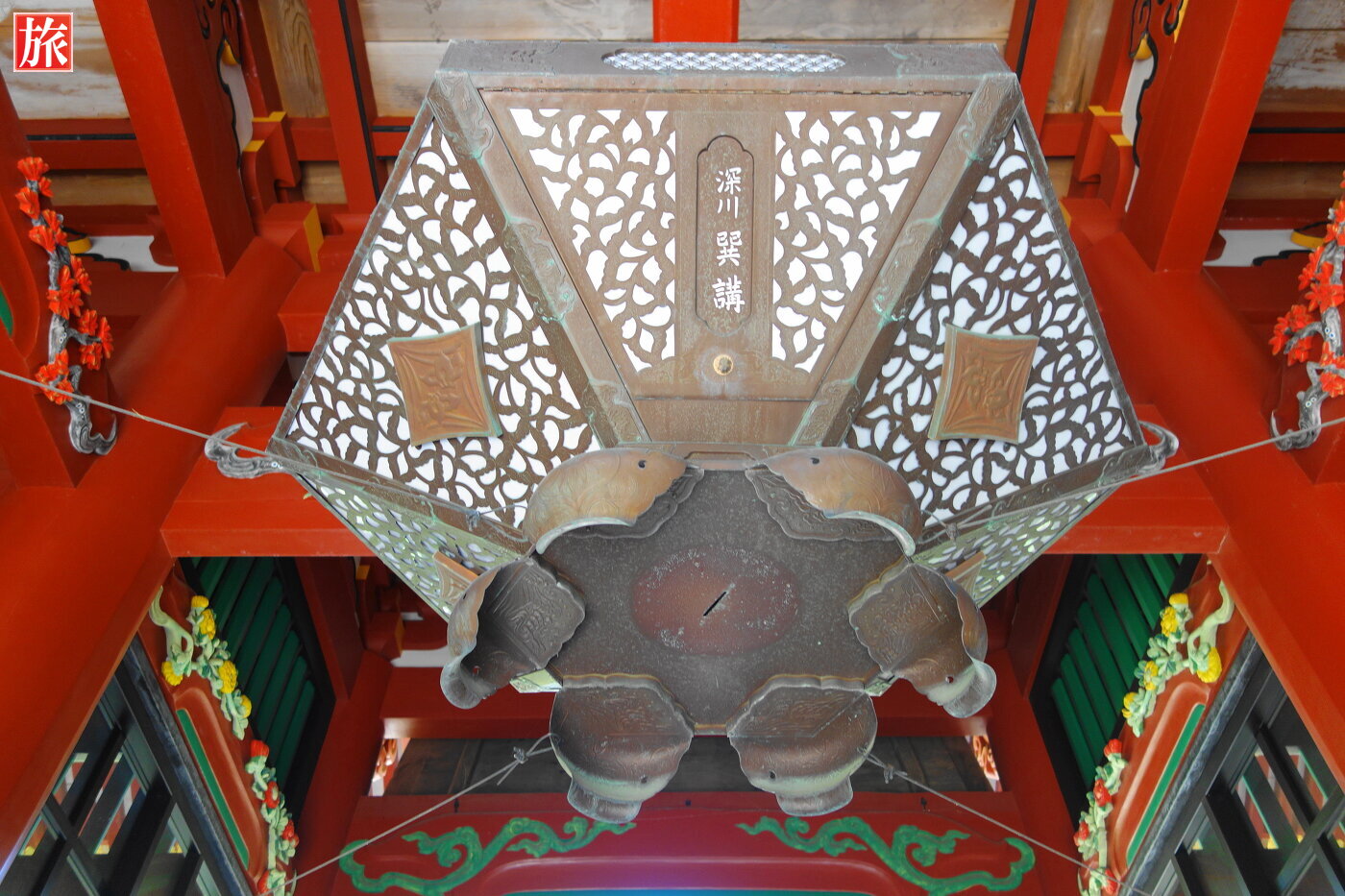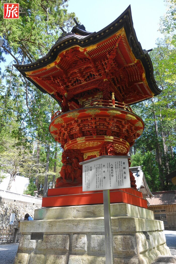 風格の有る青銅の鳥居。ご神木の先に拝殿・本殿を構えています。八棟木灯台。飾り灯台で周りは彫刻が施されています。