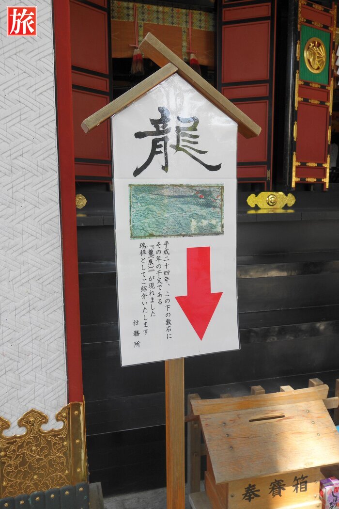 拝殿の奥にある本殿。拝殿に掛かる扁額。拝殿左手の石畳に、突如現れた龍。