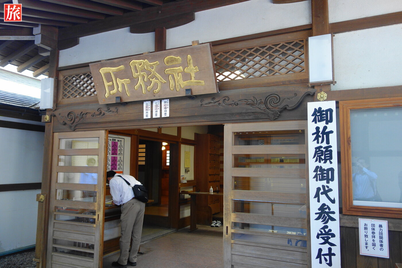 授与所前にあった手水舎。授与所、こちらでお守りを授かります。奥手はに社務所。