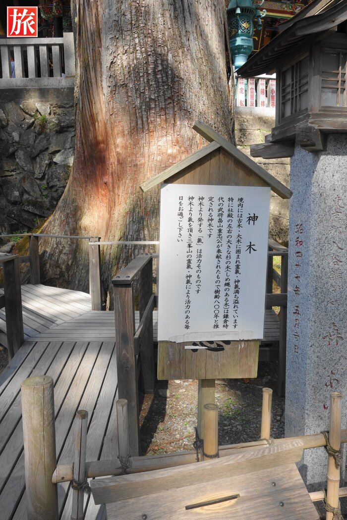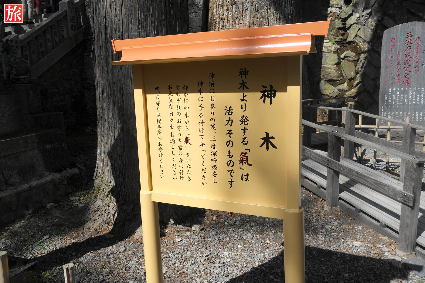 ご神木「気」の説明。ご神木(拝殿に向かって右側)