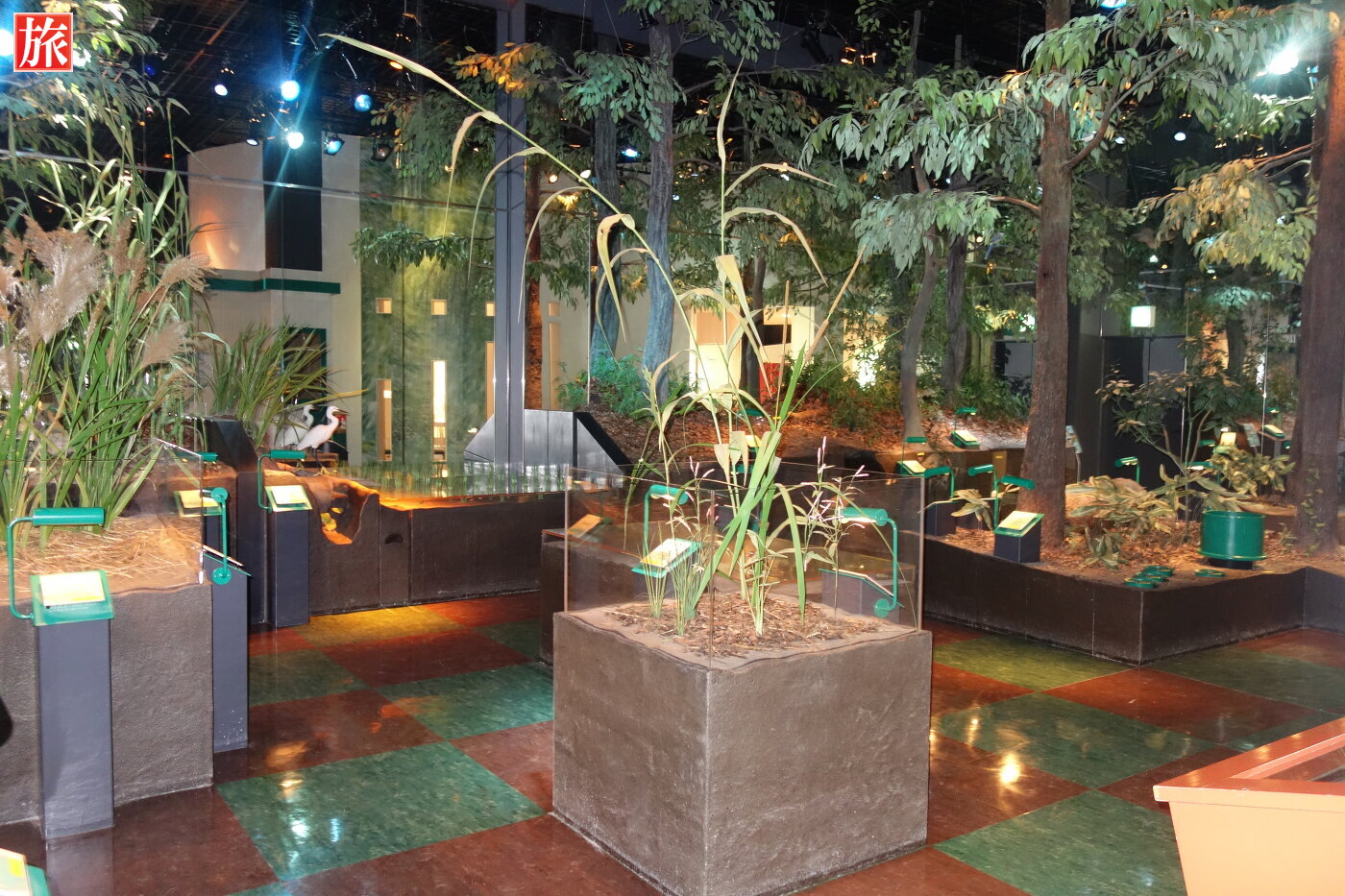 床から1mくらいの所に地面があり、木や草、亀、昆虫、たぬき、鳥などの小動物がいて、表示板をめくると枝にとまっている小鳥にスポットライトがあたって、きれいな声でさえずります。良く出来ていました。