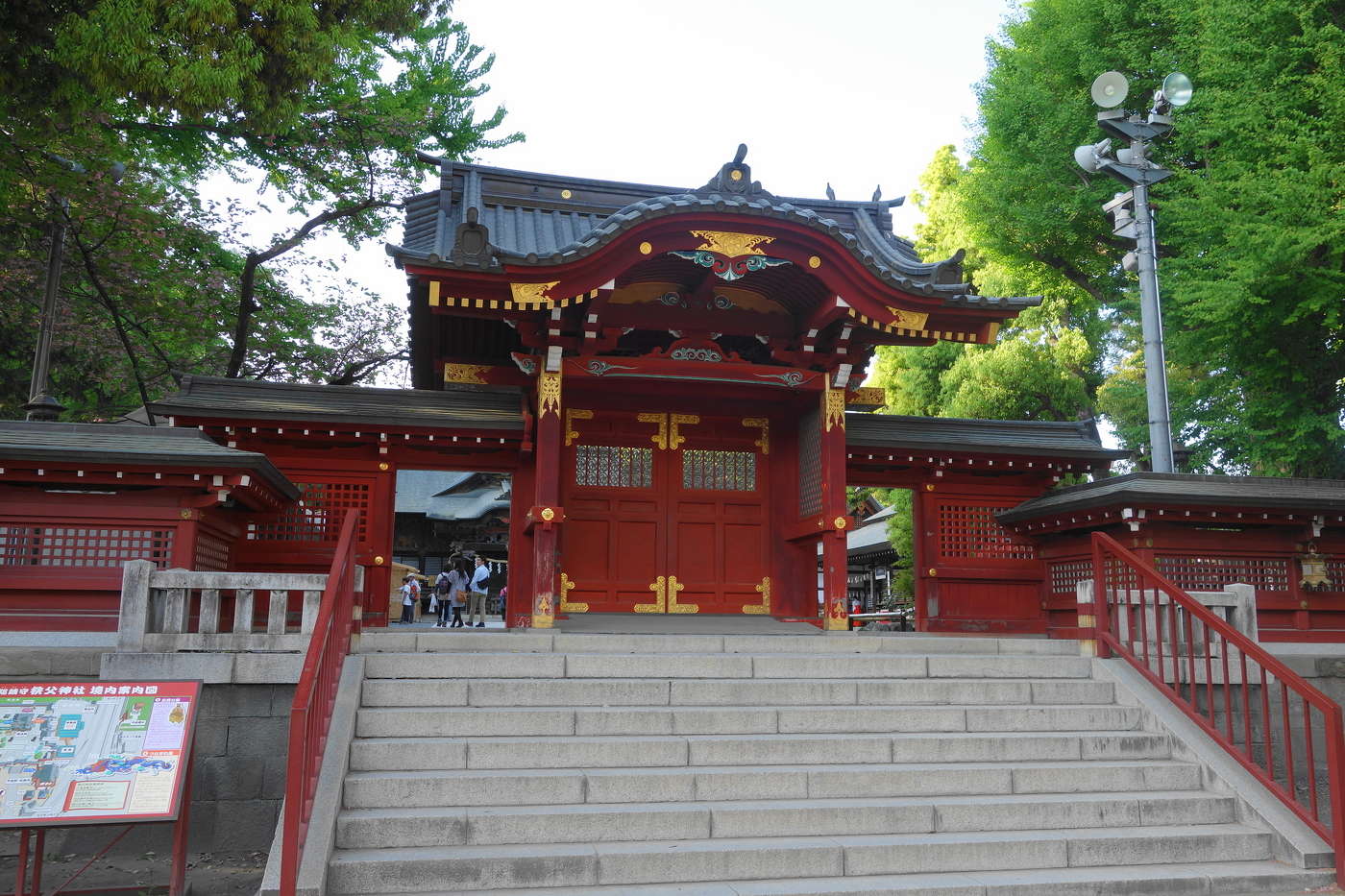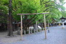 平成殿・社務所。神門。境内案内図。銀杏のご神木。東照宮。天満天神宮。禍津日社(まがつひしゃ)。