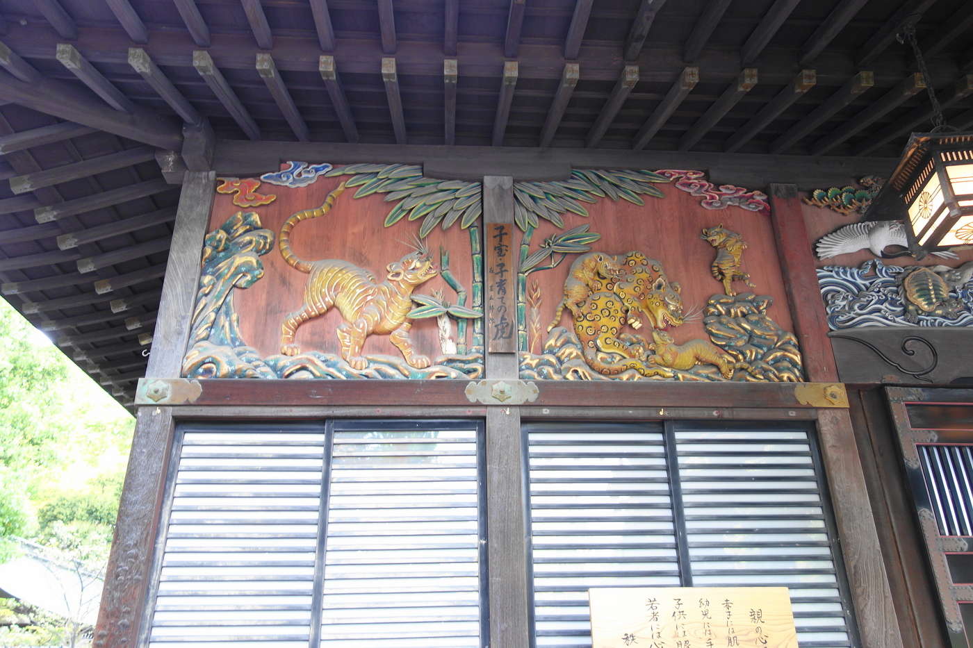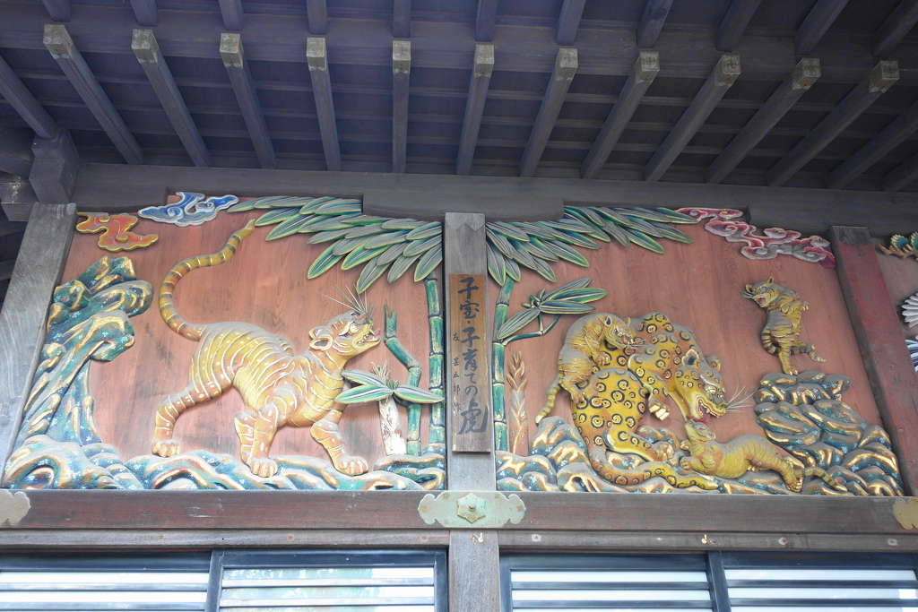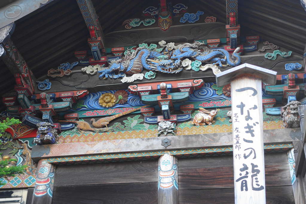 左 甚五郎作の「子育ての虎」。「赤子には肌を離すな、幼児には手を離すな、子供には目を離すな、若者には心を離すな」と親の心得が書いてありました。子育ての虎の説明板。本殿を右手から見た様子。本殿の右屋根の下に施された 左 甚五郎作「つなぎの龍」。青龍の姿は躍動感がありました。伝説を持つ「つなぎの龍」の説明板。