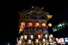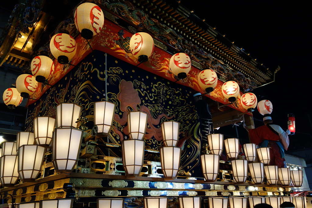中町屋台、提灯がいい感じ!屋台の後ろには鯛?が描かれています。上町屋台が通ります・・・・