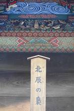 本殿の北側には「北辰の梟」の彫刻が施されています。この梟は、体は本殿方向を向きながら顔だけ正反対を向き、昼夜問わずご祭神をお守りしているそうです。北辰の梟の説明板。皇代神宮。天神地祇社。本殿裏手からみた様子。