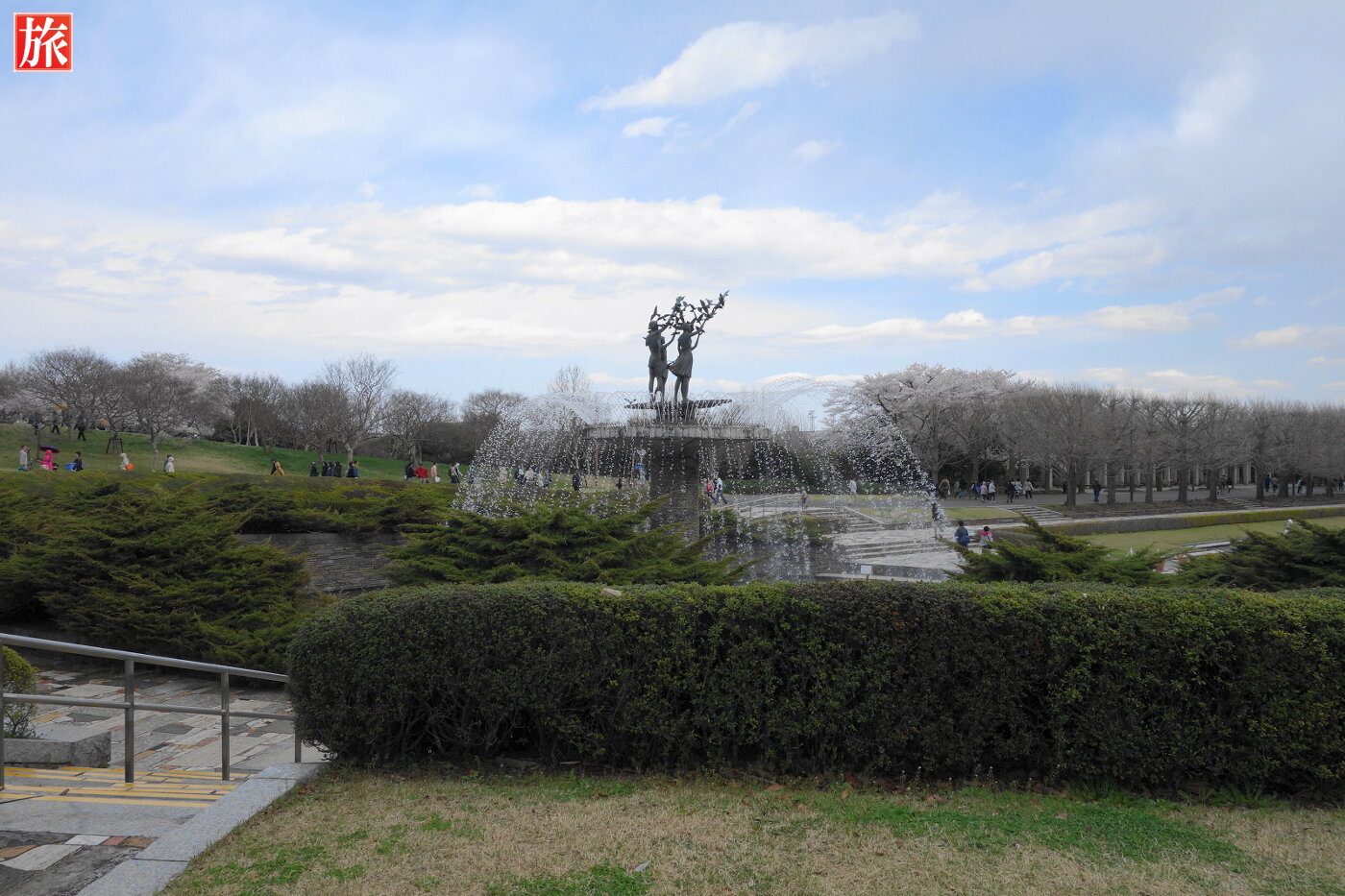 満開の時期と重なり入場口(立川口)は混雑していました。カナールにある噴水。あいにくの空模様でした。