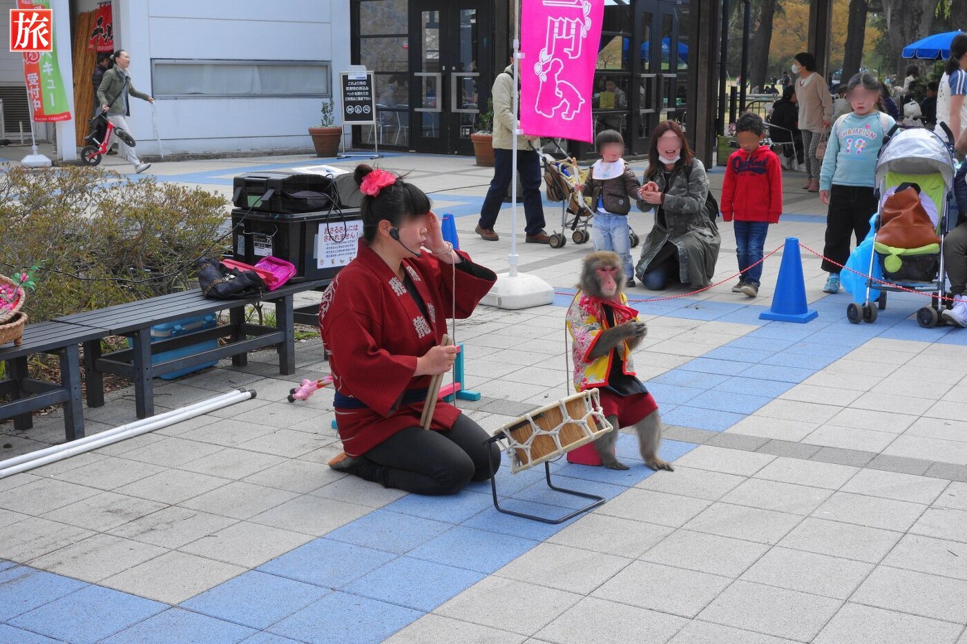 多摩ご当地グルメの出店がでていました。渓流広場レストラン前では猿まわしの芸も行われていました。園内をほぼ一周するパークトレイン。