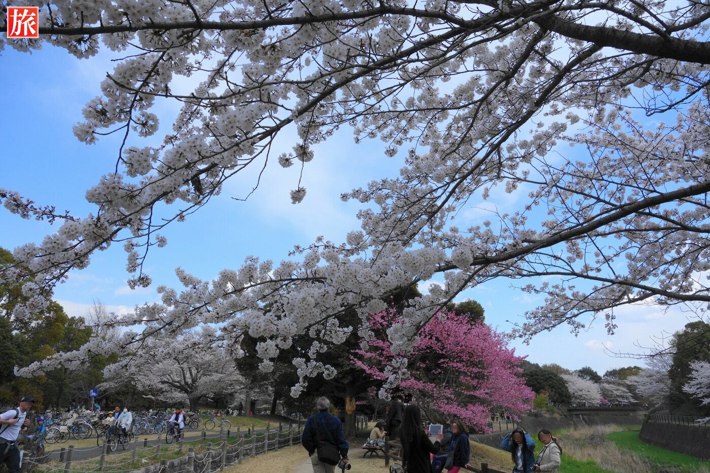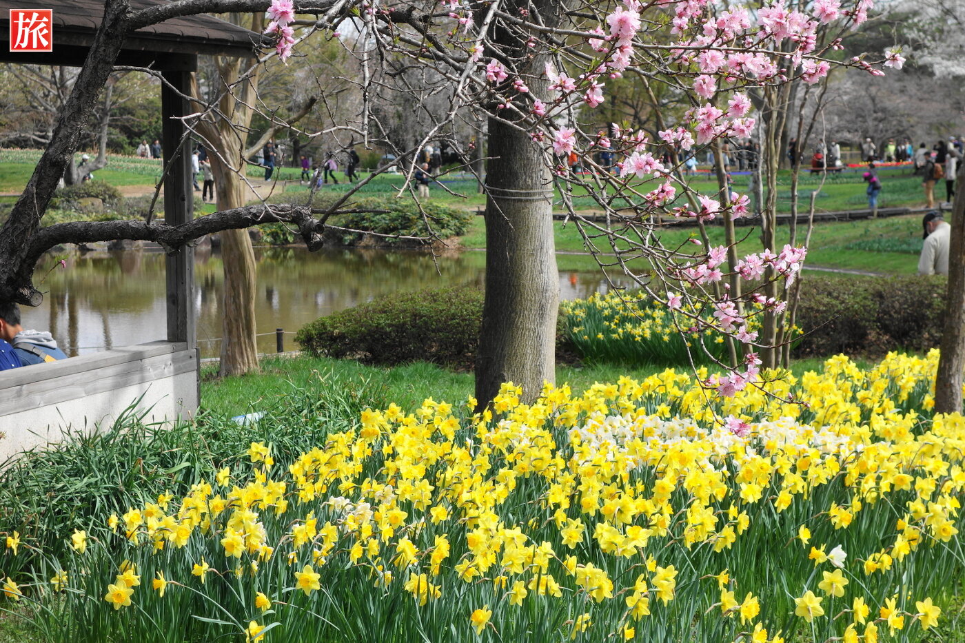 淡いピンクの桜と濃いピンクの桜が交互に咲き乱れていました。黄色いレンギョウは彩りにアクセントを加えていました。正面に見える池は水鳥の池です。