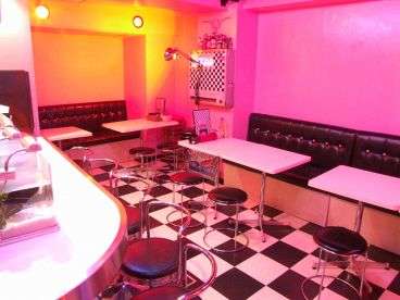 バーガーを中心とした料理とSWEETSの数々。階段を降りると広がるPOPな空間。吉岡ビルB1