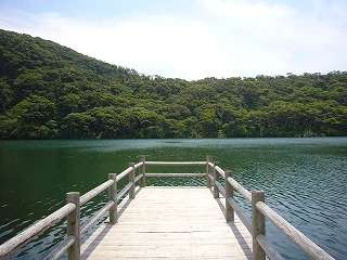 奥の桟橋には休憩所、トイレがあります。周囲2Km、水深30mの伊豆諸島最大級の淡水湖です。