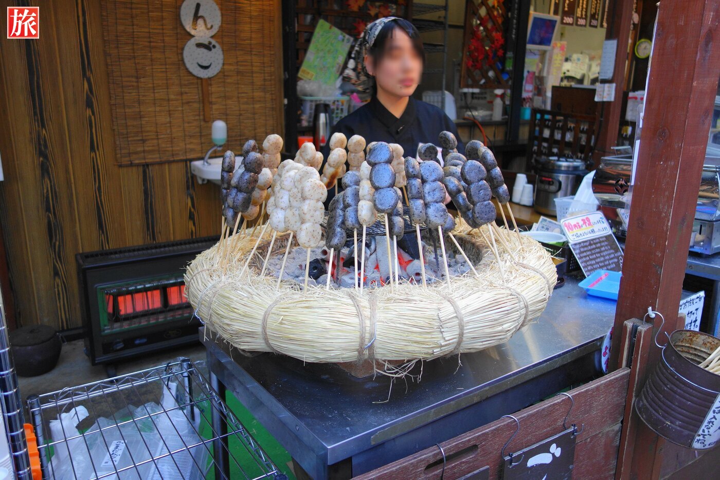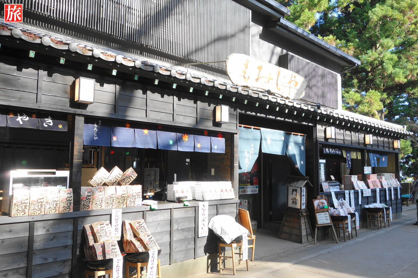 茶屋で売っている金ゴマだんごと黒ゴマだんご。山門付近にあるお土産屋さん「もみじや」。山門に到着。