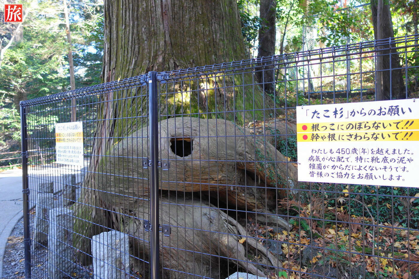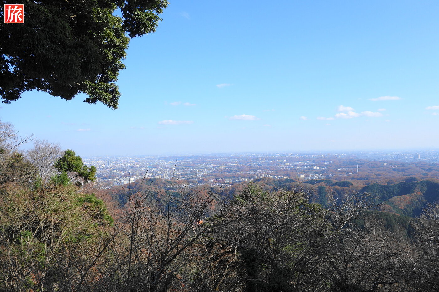 高尾山リフトの山上駅を降りた付近から街並みを望む。表参道を少し進むと高尾山さる園・野草園があり、その先に樹齢450年を越えた「たこ杉」がありました。