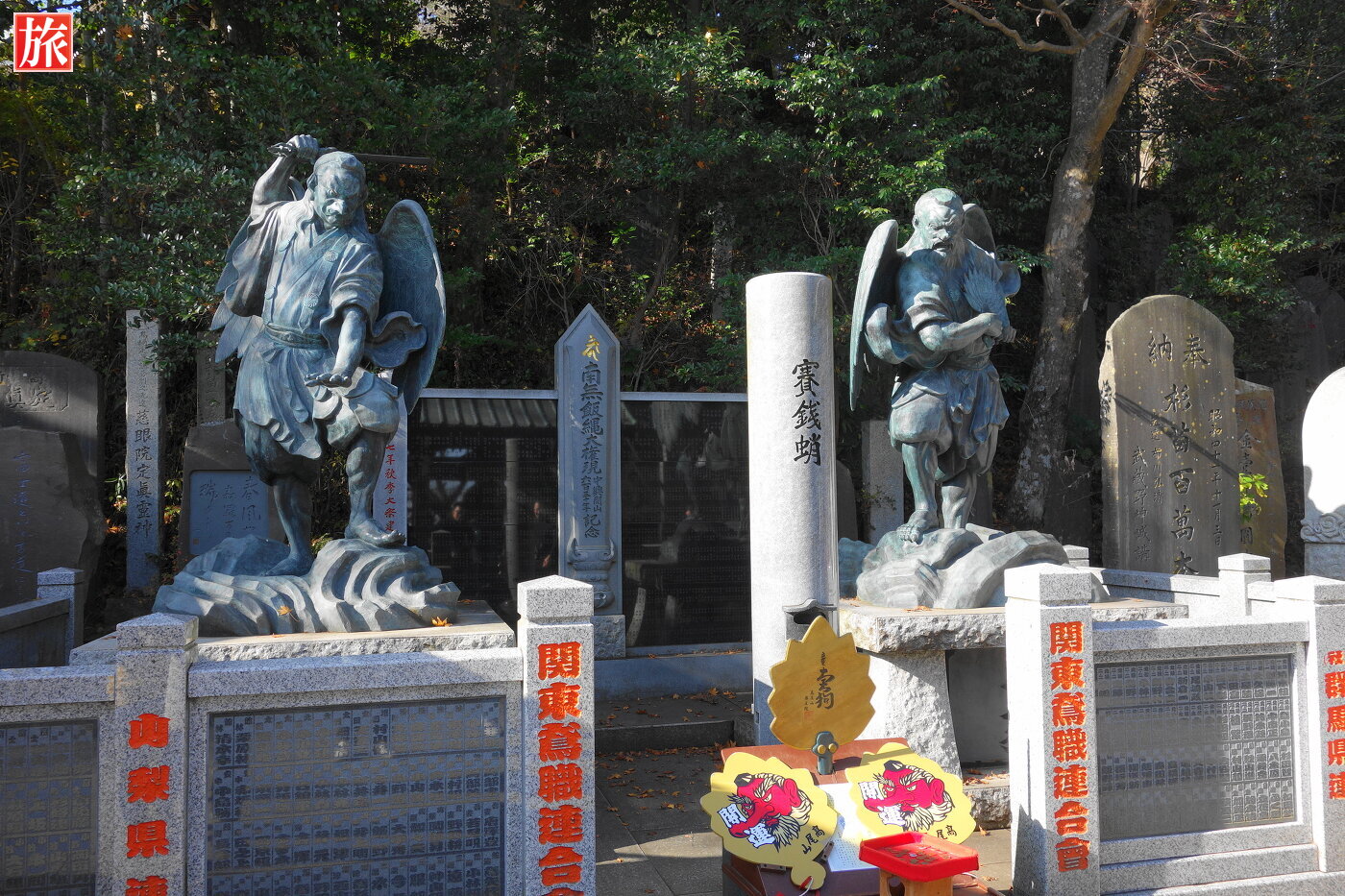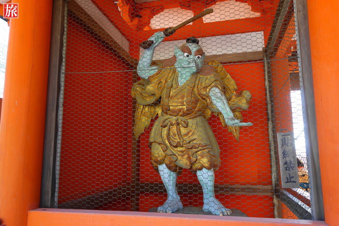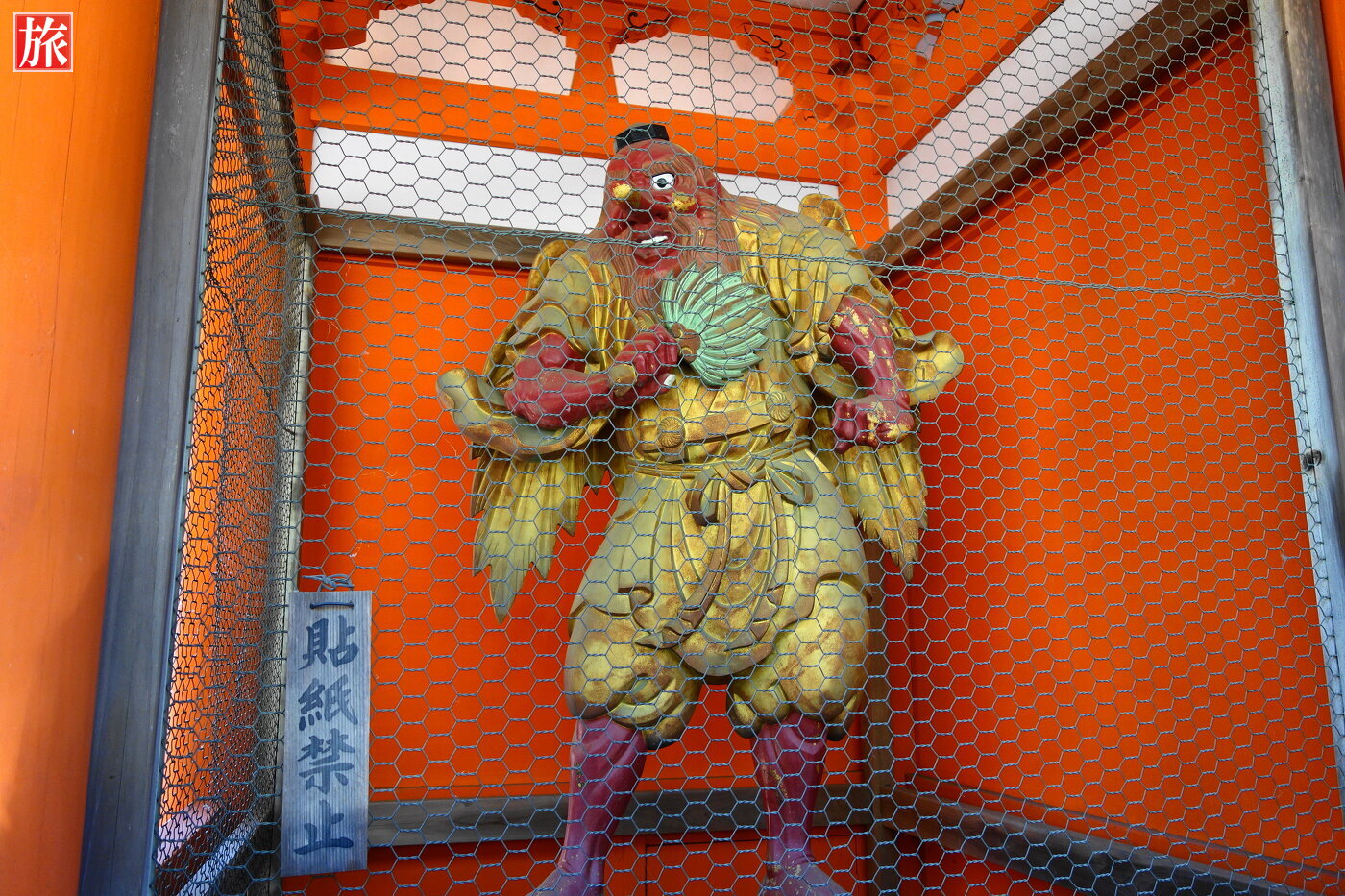 この階段を上がり門をくぐると薬王院の本堂があります。門の左右に赤と青の天狗さまが鎮座。
