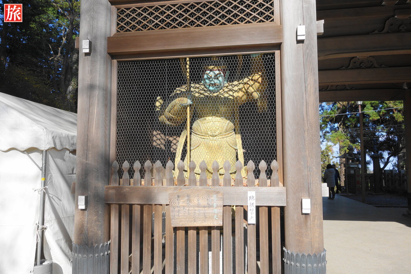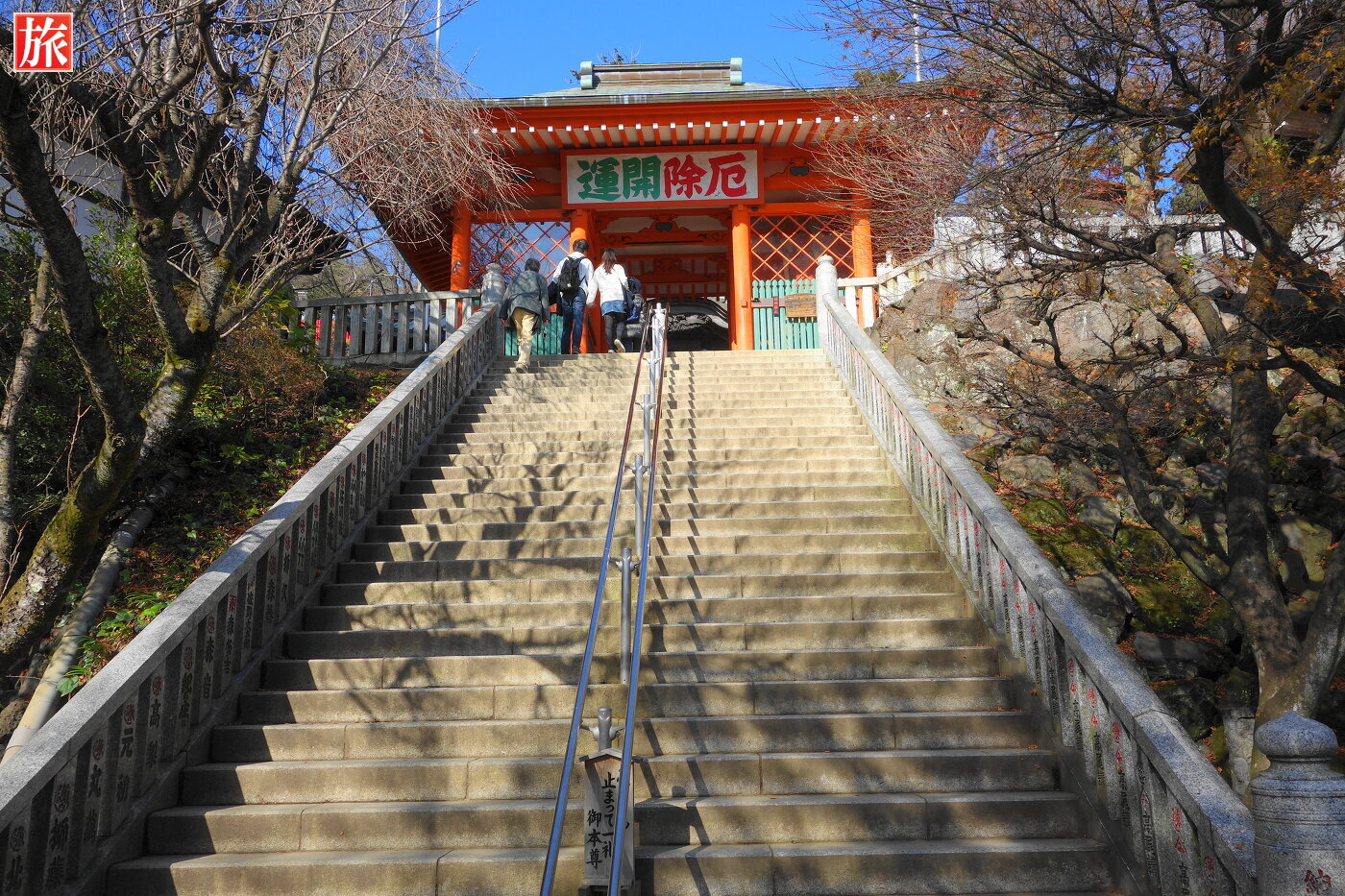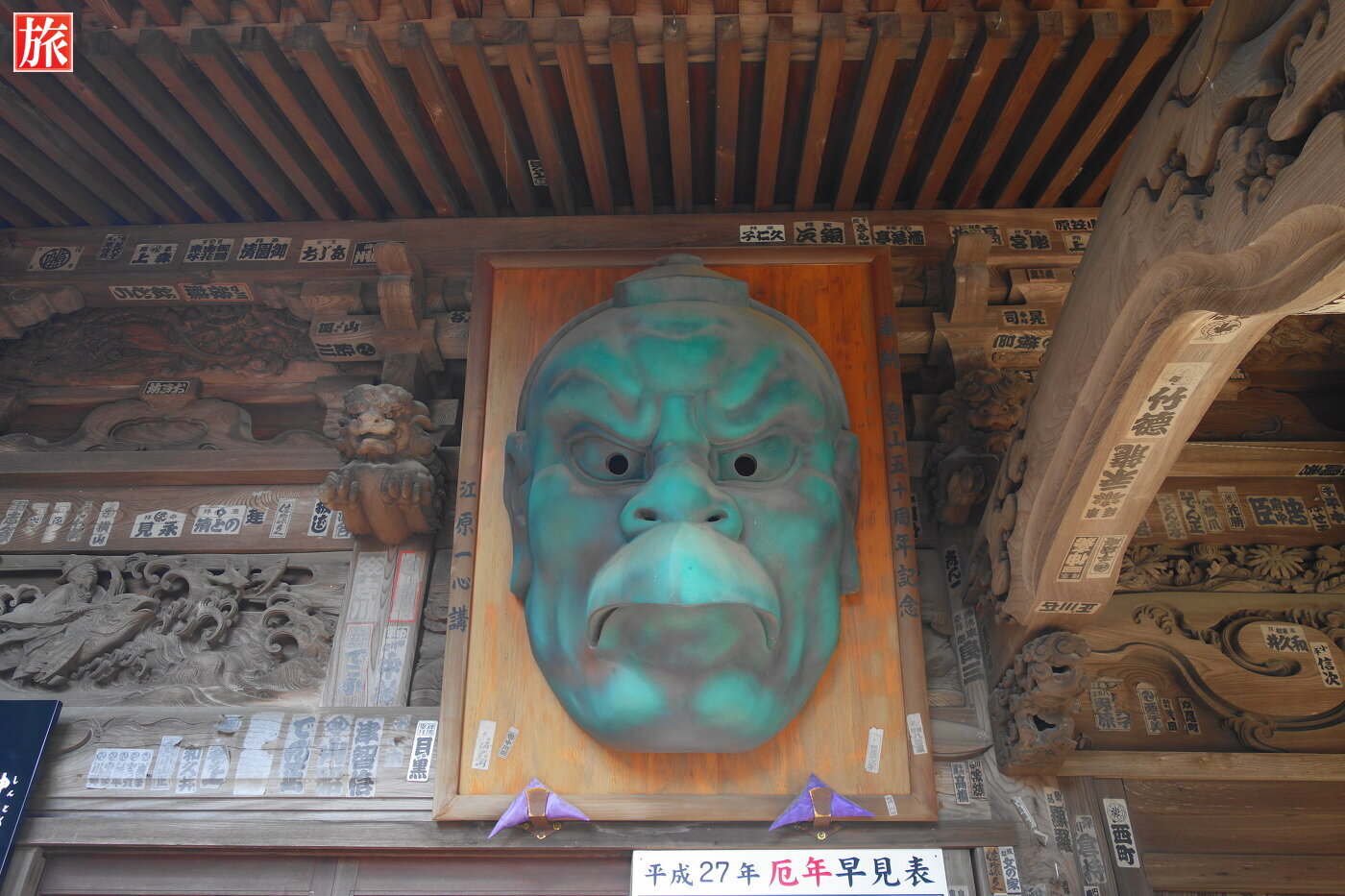 この階段を上がり門をくぐると薬王院の本堂があります。門の左右に赤と青の天狗さまが鎮座。
