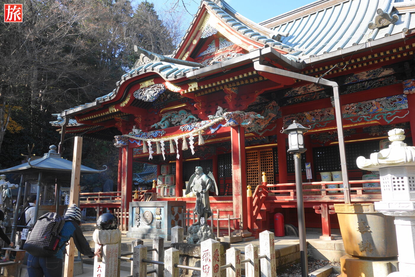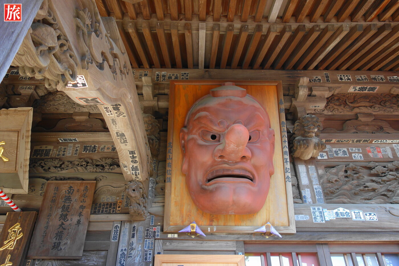 大本堂(薬師如来・飯縄権現を祀る)。左右には天狗さま。天平16年(744年)に聖武天皇の勅命により東国鎮護の祈願寺として、行基菩薩により開山されたと伝えられています。その際、本尊として薬師如来が安置されたことから薬王院とよぶようになったとのこと。