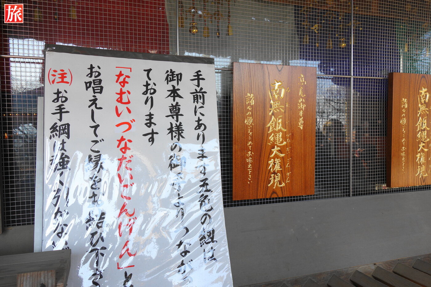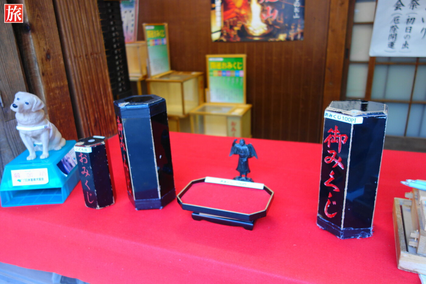 大本堂から延びる5色の紐はご本尊様の御手とつながっています。「なむいづなだいごんげん」と唱えご縁を結ぶそうです。境内の様子。おみぐじ。