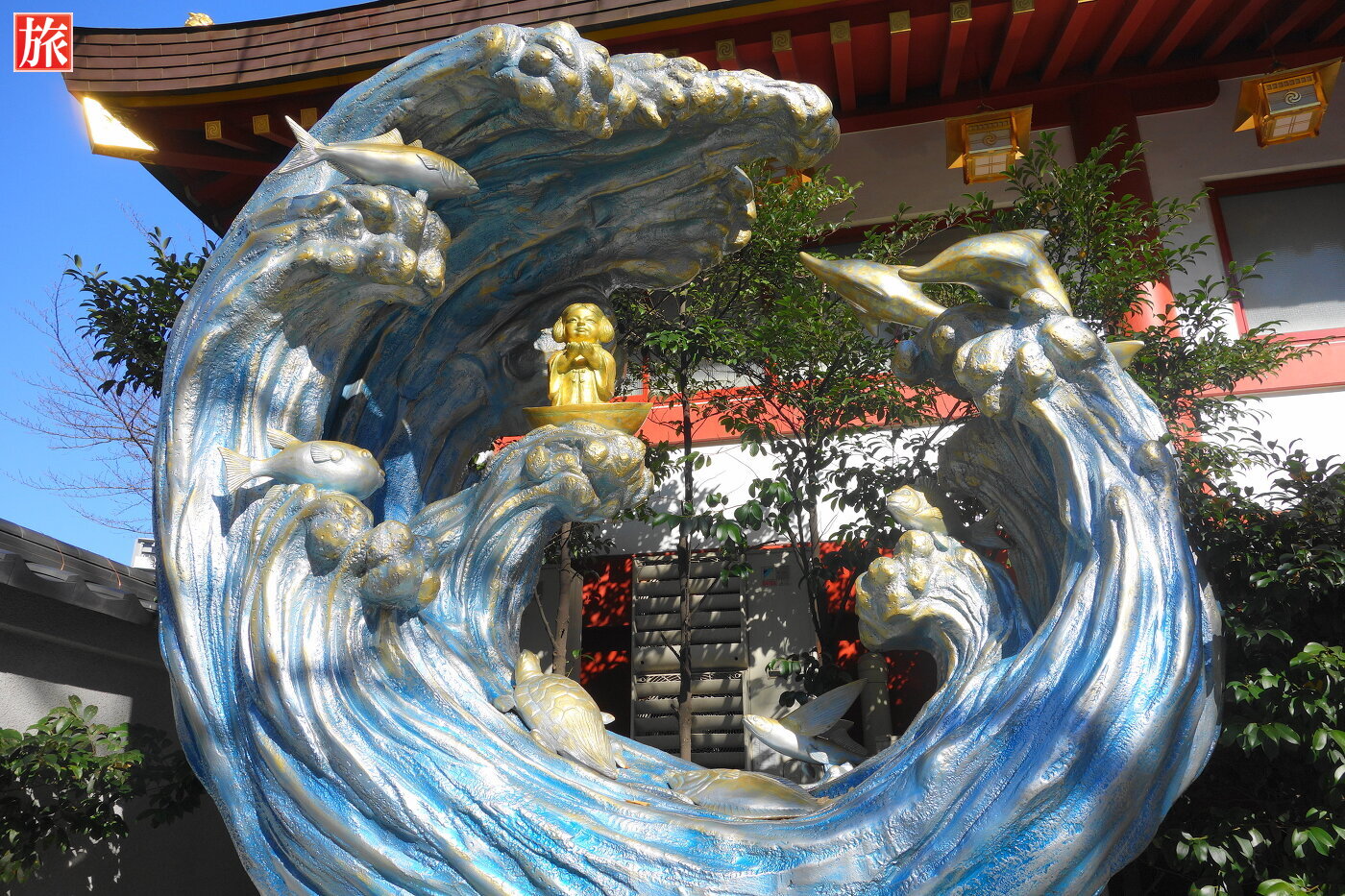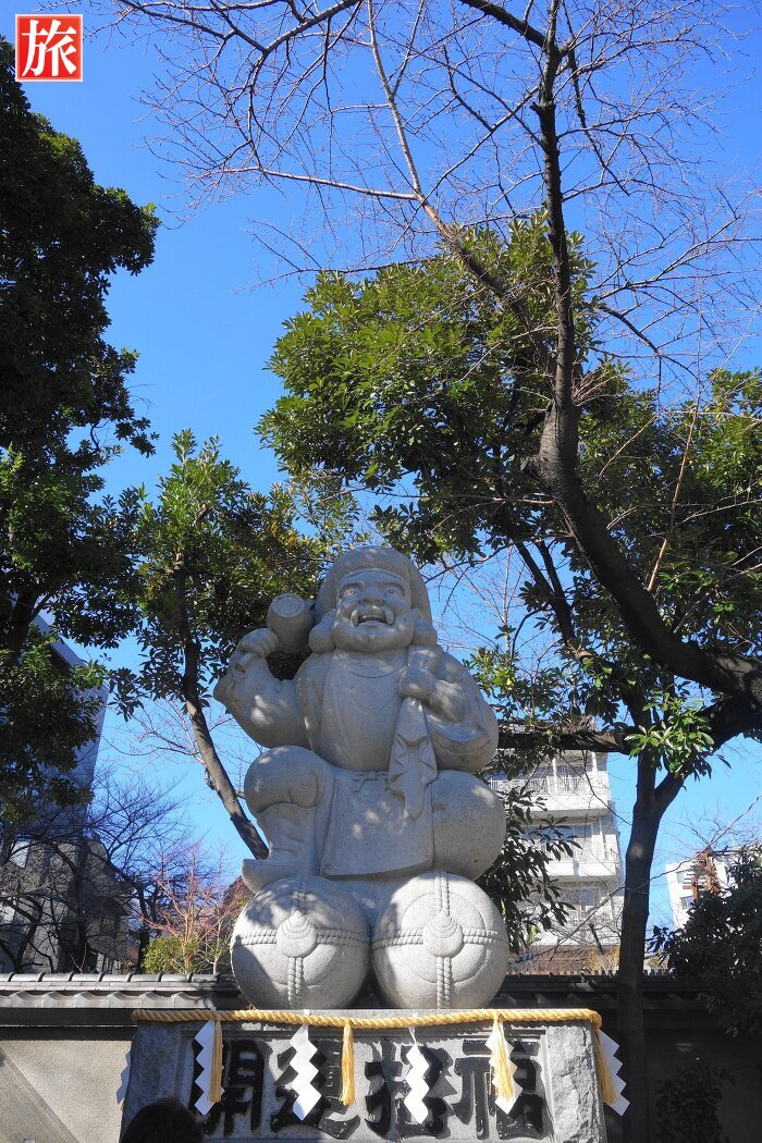 魚河岸水神社(水神社)。魚河岸水神社の説明。高さ6.6メートル、重さ約30トンの「だいこく様尊像」。石造りとしては日本一とのことです。お守りをゲット!