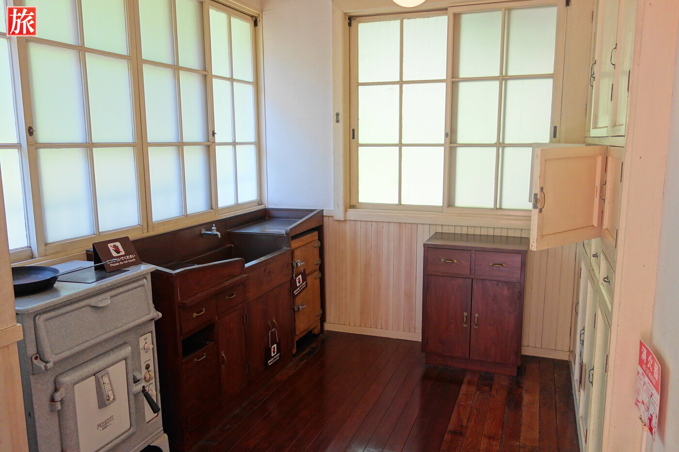 三井八郎右衛門邸。倉内は写真撮影禁止でした。部屋の様子(1階)。庭の風景。近代的なキッチンは1879(明治30)年ごろ京都に建てられ戦後港区に移築されたもの。