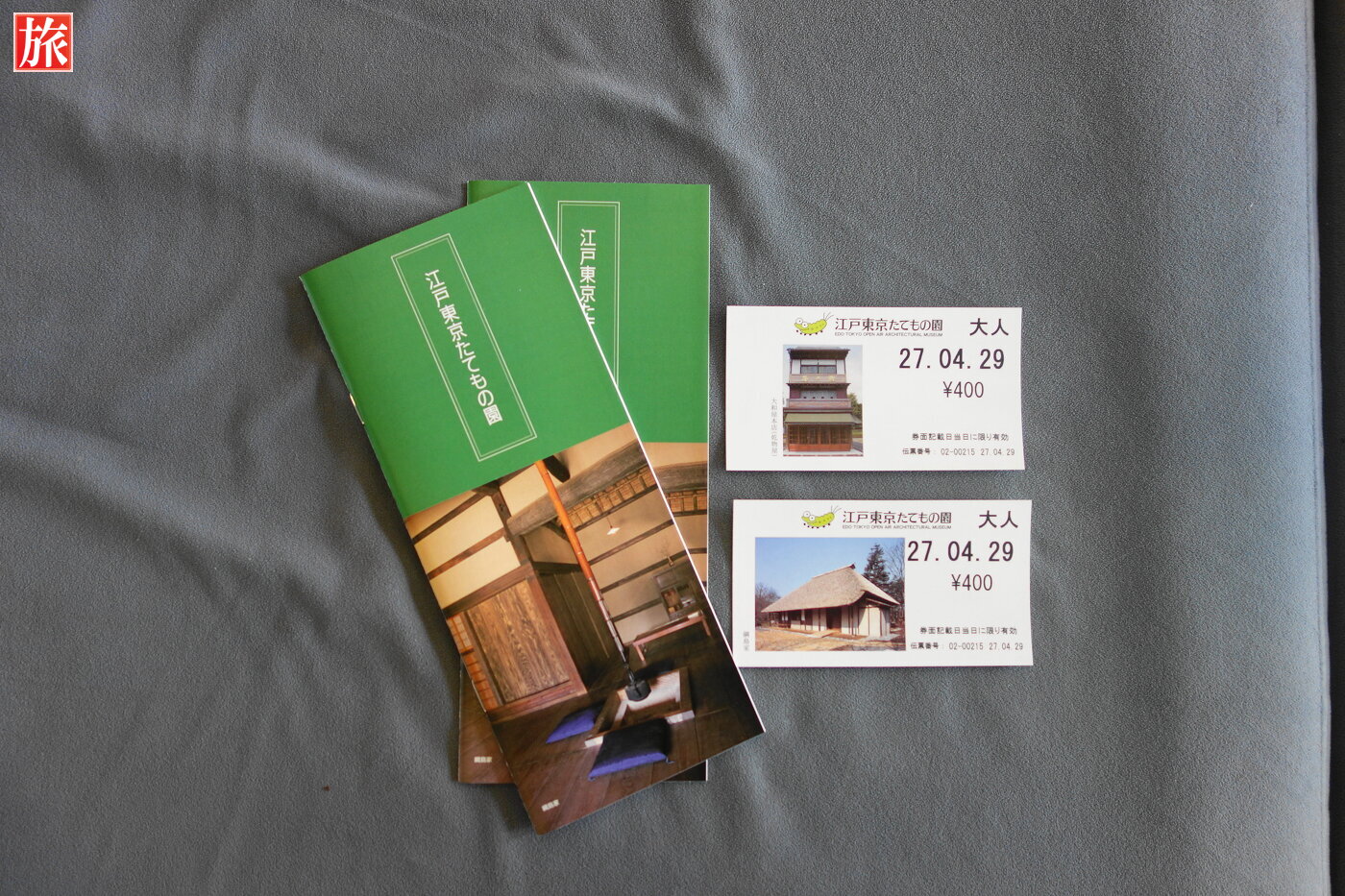 江戸東京たてもの園全体図。入場料は一般大人一人400円。入場券とパンフレット。ビジターセンター内ミュージアムショップ&カフェ。