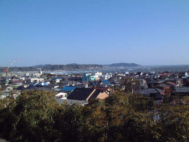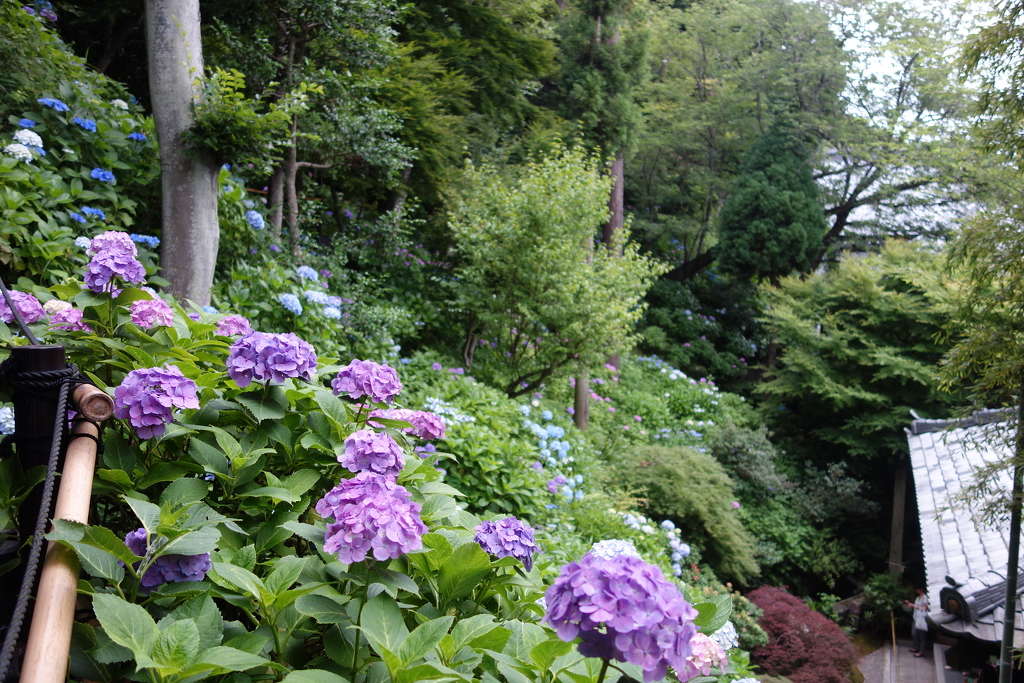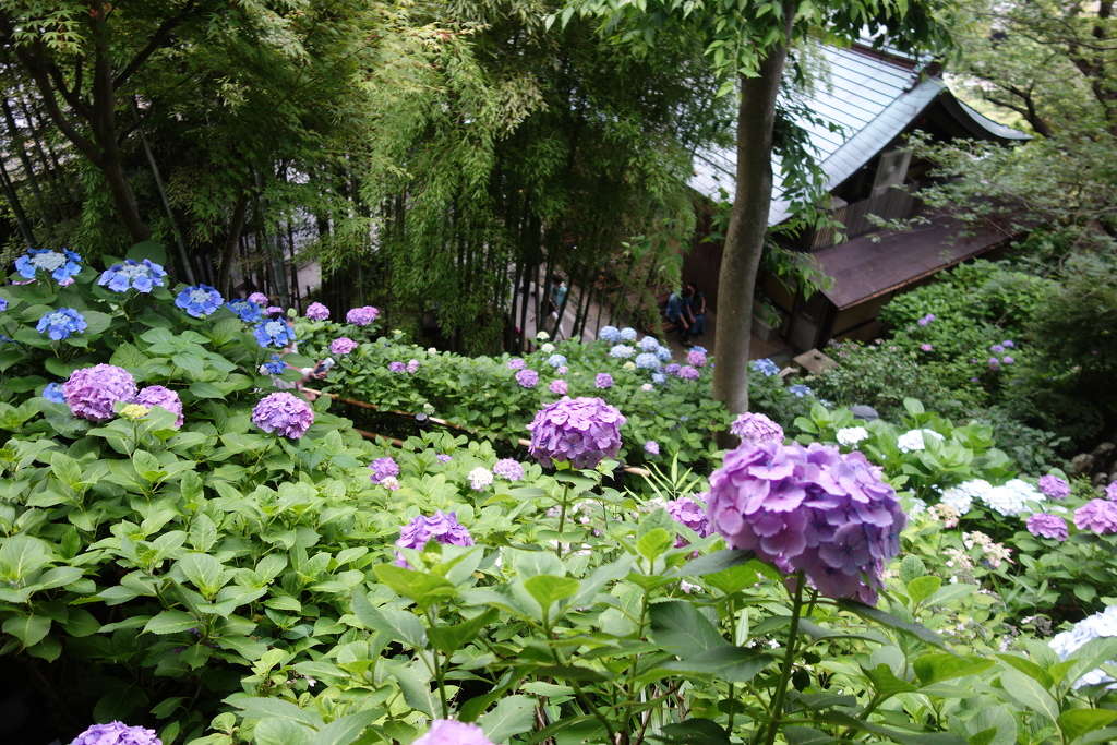 「あじさい路」眺望散策路の上段では、由比ヶ浜の海を眺めることもできます。経蔵方向を見下ろす