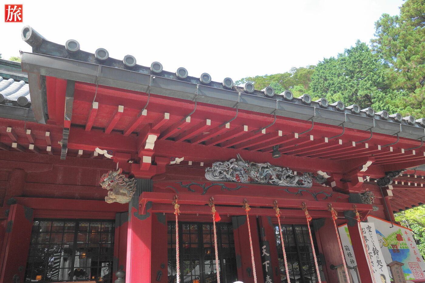 拝殿。頭上には龍の彫刻が施されています。九頭龍神社新宮は新たに屋根が新設されていました・・・年々観光地化されて少し寂しい気もします
