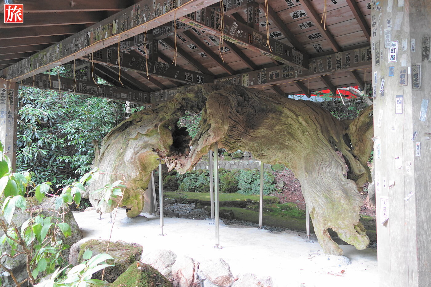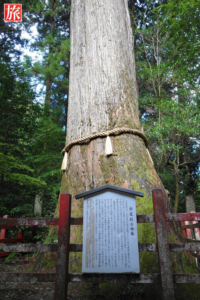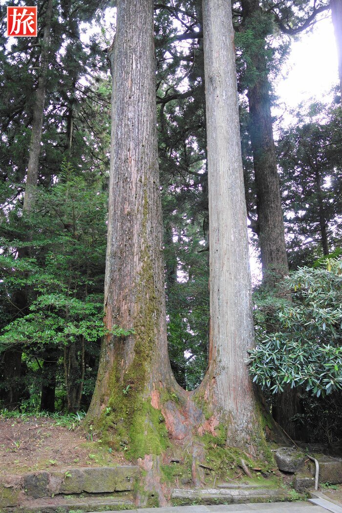 御神木の安産杉。境内には、総数100本以上のヒメシャラ純林があるとのこと。神門の近くにあった二本仲良く寄り添う杉。