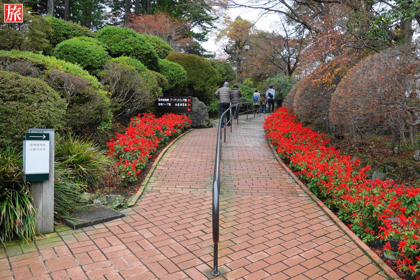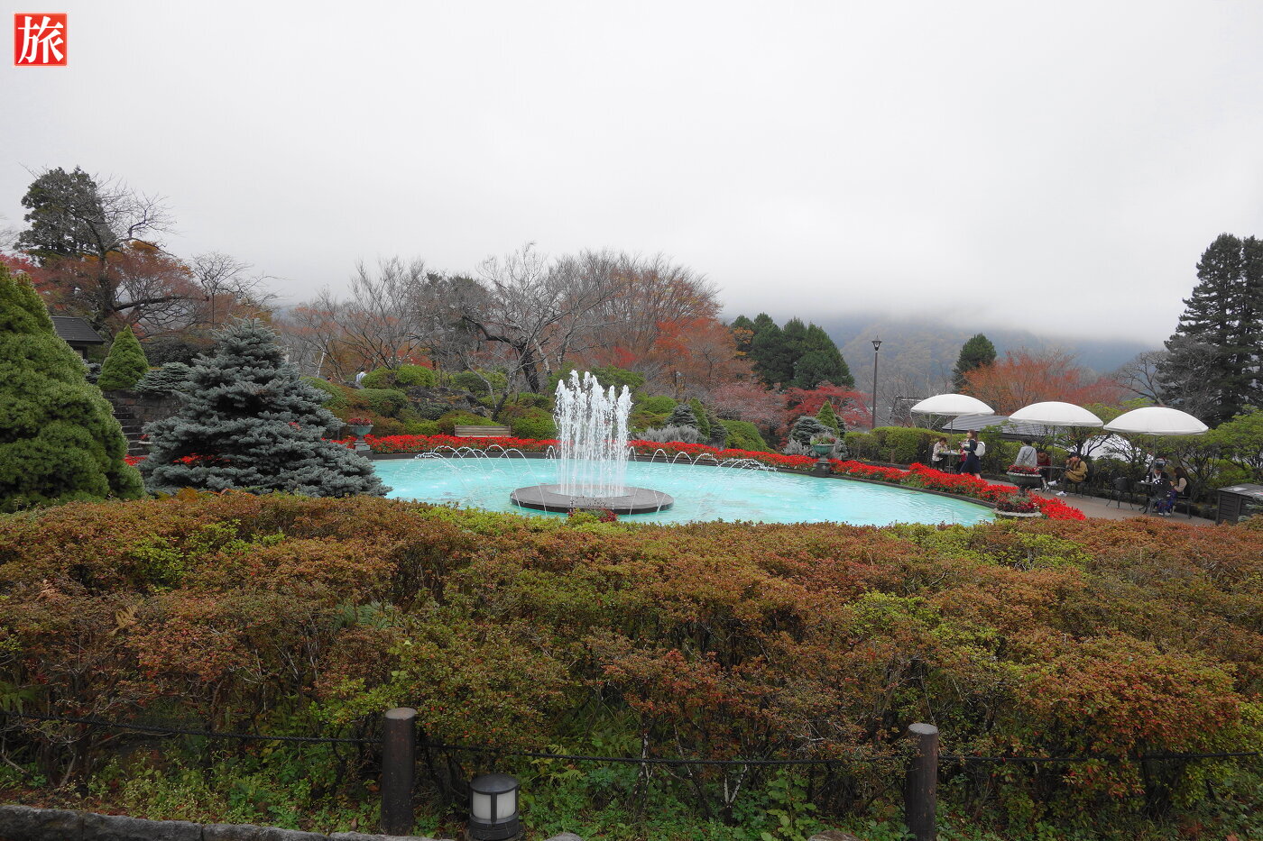 噴水へのアプローチは緩やかな坂で両側に花が咲いていました。強羅公園シンボルの噴水。紅いサルビアの花が綺麗。早雲山は霧に包まれ紅葉の山並みは見れませんでした・・・