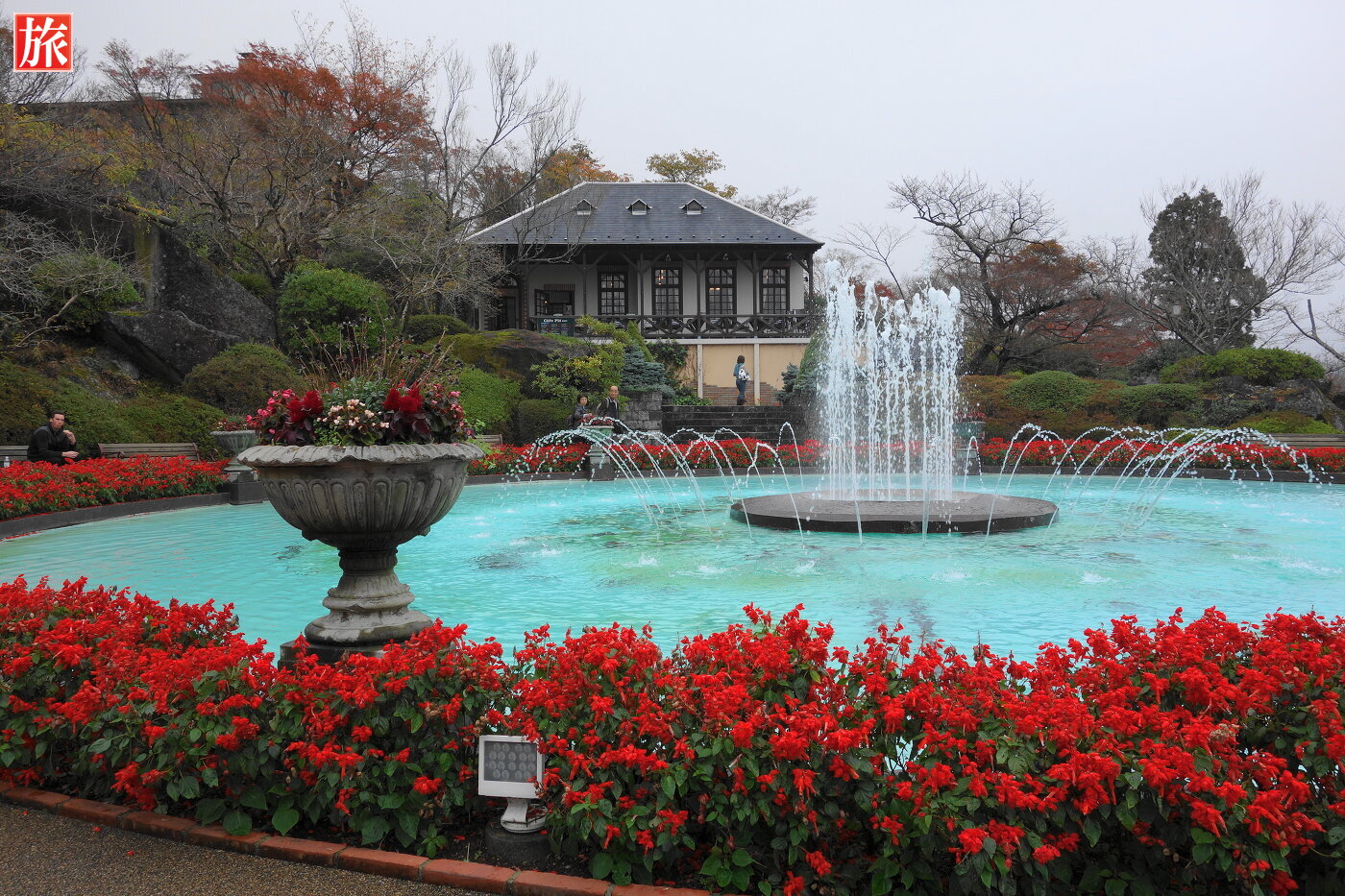 噴水を中心に左右対称に造園され、バラやシャクナゲなどの花と緑の木々が調和している。開園は1914年(大正3)。熱帯植物館や茶室などがある。