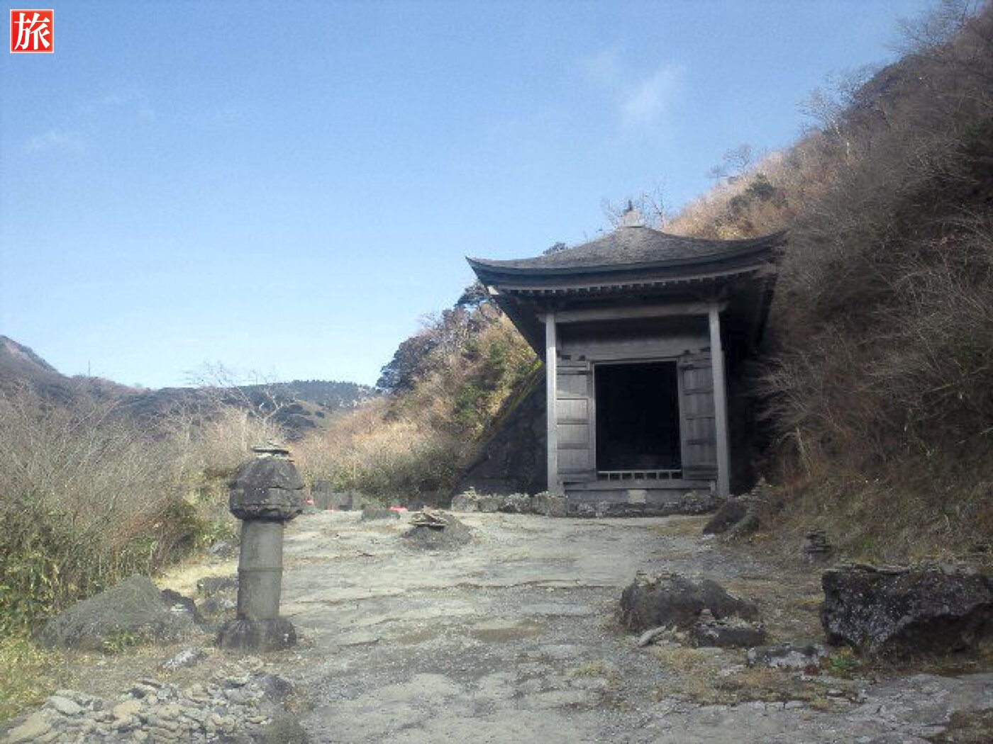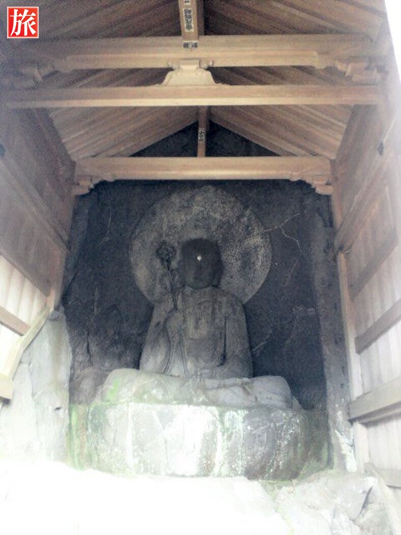 精進池から国道1号を挟んで反対側(東側)にある磨崖仏。安山岩製、像高3.2メートルの地蔵菩薩坐像で、覆屋で保護されている。